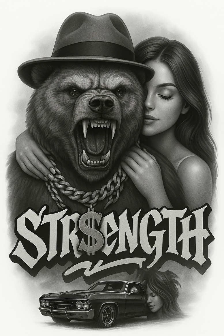 Bear and woman portrait with car and bold lettering; tattoo design, cover-up-ready pattern.