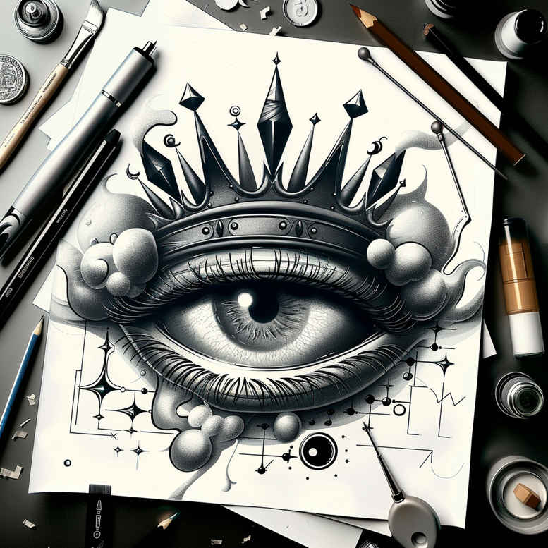 This AI-generated tattoo project presents a striking black and grey study centered on an eye beneath a crown, rendered on a sheet of paper with visible drafting tools—pen, pencil, marker and brush—around it. The eye is captured with fine line tattoo precision: crisp lashes, a detailed iris, and subtle shading that reads as dimensional within a flat surface, while the crown adds a regal, symbolic accent. Surrounding the central motif, a pattern of small stars and geometric motifs frames the composition, offering rhythm and a built-in texture that can translate into a larger sleeve or back piece. The drawing reads as a ready-to-tattoo design or as a custom tattoo design concept, with a strong black-and-grey palette that suits realistic tattoo style and works across skin tones. The piece nods to Japanese style tattoo in its clean line work and balance of shading, yet remains versatile as a rose tattoo design or lotus flower tattoo motif could be integrated as a personal touch for meaningful tattoos. For those seeking small tattoos or flower tattoos with symbolic meaning, this design can be adapted to fit a compact canvas or extended into a larger body art project. Because the image leans toward dark values, it is particularly suitable for a cover-up: the dense shading and crisp lines create opportunities to layer over old ink while preserving depth. The inclusion of pattern elements also makes it easy to expand into additional detailing, whether adding infinity or tribal-inspired lines, or family motifs that personalize the concept. As an AI-generated tattoo project, it demonstrates how digital concepting can yield precise, scalable ink-ready designs for real-world tattooing, and underscores the potential of ink and line work to convey vision, protection, and transformation in a meaningful tattoo. In essence, the crown-and-eye motif symbolizes sovereignty and insight, the black-and-grey palette supports a realistic tone, and the patterning affords flexibility for cover-up solutions — an ideal starting point for a refined tattoo design that can evolve with the wearer.