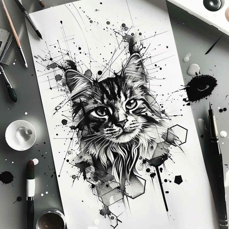 This AI-generated tattoo project presents a cat portrait rendered in black and grey with a bold splatter background and angular geometric accents. The focal point is a lifelike feline head, its fur defined by fine line contours and graduated gray wash to create depth, while a piercing gaze anchors the composition. Surrounding the cat, ink splatters break into diamond-like shards and soft blotches, delivering a contemporary graphic edge that reads well as a tattoo design on skin. A flower motif sits behind the cat, providing organic counterbalance to the sharp lines and ensuring a harmonious blend of nature and abstraction. The piece fuses realism with pattern-driven ornament, making it versatile for placement on the forearm, shoulder, or back. Given the dense blacks and purposeful negative space, this design is an excellent option for a cover-up, capable of masking older work while leaving room for new details if desired. Symbolically, the cat conveys independence and mystery, the flower suggests growth and renewal, and the splatter elements symbolize spontaneity—an interplay that suits meaningful tattoos, small tattoos, or larger body art expansions. Technically, the work relies on crisp line work for the cat’s features, subtle gray shading for volume, and controlled ink splatter to create texture without muddying the design. It nods to Japanese style tattoo influences through its balance of line and form while remaining in a classic black and grey palette and easily adaptable to include infinity, rose, or lotus motifs for personalized meaning. This is an AI-generated tattoo project, illustrating how algorithmic concepts can translate into durable, striking tattoo design that ages gracefully and remains legible across sizes. The composition is designed with longevity in mind; the choice of black and grey ensures strong contrast, and the careful layering of lines and washes helps preserve detail as skin ages.