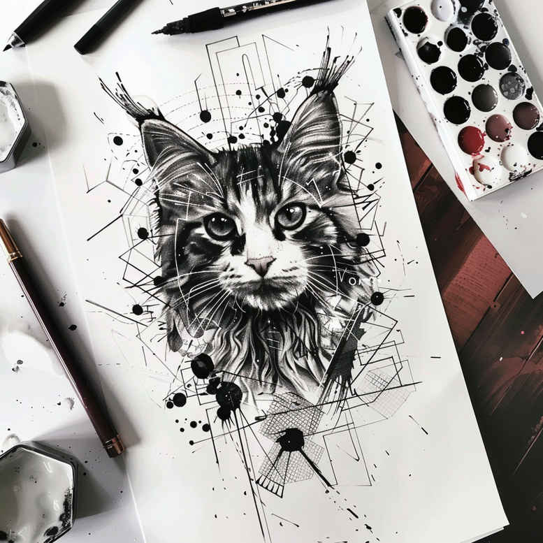 This cat portrait tattoo design presents a refined synthesis of line precision, texture, and kinetic energy conveyed through splatter and geometric accents. The central feline head is rendered in black and grey with fine-line contouring and subtle shading that suggests fur direction and depth without overpowering the composition. Surrounding the portrait, a network of geometric lines, dotwork, and splatters radiates outward, creating a dynamic frame that reads as a study in ink control and clarity. The piece sits on a clean white surface, as if drawn on paper during an ideation session, with studio tools such as a brush and palette hinting at the tactile process behind the concept. Visible elements include the cat, palette, brush, and paper, establishing the motif as a tattoo design conceived in a traditional drawing workflow. The design evokes a hybrid aesthetic: a modern fine-line method rooted in black-and-grey realism, with nods to Japanese and tribal tattoo sensibilities through balanced negative space and restrained shading. When translated to skin, the cat portrait can function as a striking standalone piece or be extended into a sleeve with lotus flower motifs, infinity loops, or elongated ornamental lines, offering a path toward broader narrative ink. The pattern-like geometry and splatter texture give it a contemporary edge that remains timeless, making it an ideal choice for meaningful tattoos that celebrate personality, guardianship, and curiosity. This concept is published as an AI-generated tattoo project concept to illustrate how digital sketches can become credible tattoo designs and serve as a starting point for a custom tattoo design process, with further refinement by the chosen artist. In practice, fine-line weight, shading gradients, and the balance of negative space are adjusted to fit the wearer’s anatomy, ensuring legibility on both small tattoos and larger body art canvases. Keywords including tattoo, tattoo design, meaningful tattoos, fine line tattoo, lotus flower tattoo, infinity tattoo, tribal tattoo, rose tattoo design, small tattoos, flower tattoos, custom tattoo design, Japanese style tattoo, black and grey, realistic tattoo, body art, ink appear naturally in the prose to support discovery by enthusiasts and clients alike.