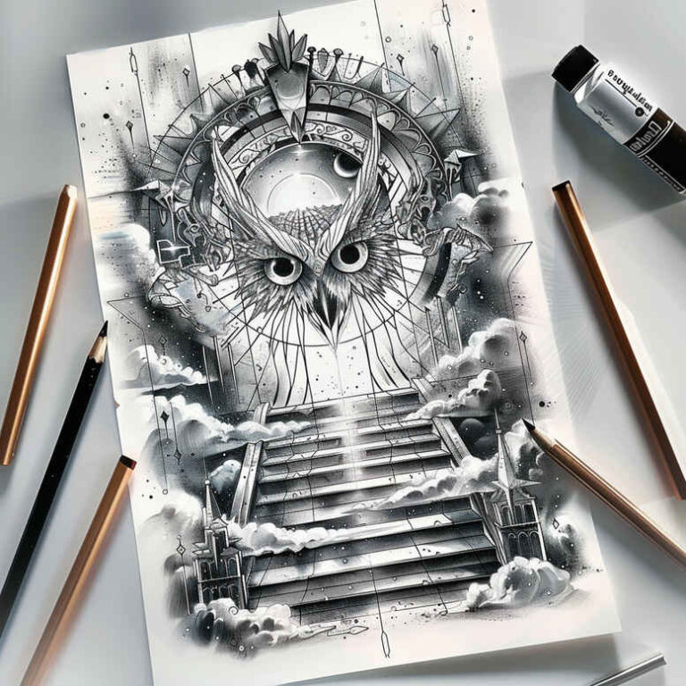 This tattoo concept presents a nocturnal owl perched before an intricate mandala that radiates from a central eye motif. Rendered in a precise fine-line tattoo technique, the drawing relies on black-and-grey shading, cross-hatching, and stippling to create depth without overwhelming the skin. The owl’s feathers are rendered with layered line weight to convey texture, while the mandala’s geometric petals form a halo that anchors the composition and suggests balance, protection, and cyclical renewal. A staircase recedes behind the central figures, adding perspective and a metaphor for ascent and moving through darkness toward light. An ink bottle and a pencil lie at the margins of the scene, nodding to the drawing process and signaling that this piece is a concept or study for tattoo art rather than a finished work. The palette remains strictly black and grey, ensuring a timeless result suitable for various skin tones. As a tattoo design, the piece carries meaningful symbolism: wisdom and vigilance in the owl, unity and spirituality in the mandala, and the journey implied by the stairs. The black-and-grey palette supports realism in the owl’s gaze and the mandala’s precision, enabling a refined result for small-to-medium placements such as the forearm or shoulder, or as a larger cover-up concept when integrating existing ink. Given the heavy shading, it is particularly well-suited for cover-up work, as dense blacks can mask prior tattoos while preserving intricate detail. This is an AI-generated tattoo project concept, offered as a guide for artists seeking a meaningful, high-contrast tattoo design. The mandala’s pattern invites rhythmic movement, with potential to integrate lotus or infinity motifs, and to blend Japanese-style or tribal influences within a cohesive black-and-grey frame. The result is timeless body art that remains legible at small scales yet scales up for a larger canvas, embodying the enduring appeal of fine-line tattoo technique and realistic texture.