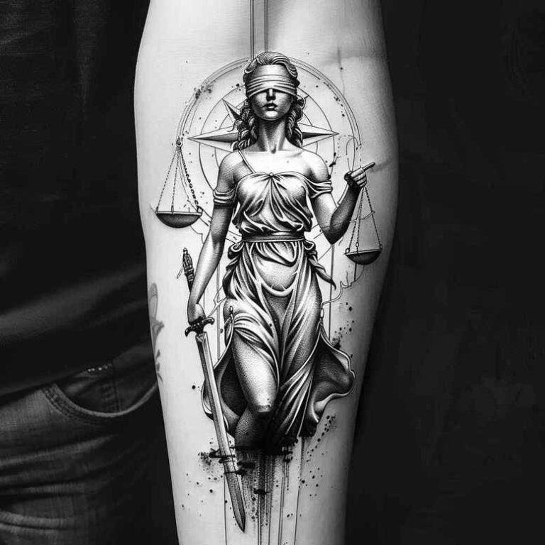 An elegant black and grey study of Themis, the ancient Greek goddess of justice, rendered as a poised statue crowned by calm authority. The composition centers a female figure draped in flowing robes, her stance balanced by the horizontal symmetry of her scales. Subtle shading and fine line work create a sense of marble texture and gentle movement, while delicate ornamental lines radiate behind the figure like a compass or mandala, hinting at order and judgment. The design blends realism with illustrative flair, employing soft gradients and crisp edge work to capture the contrast between light and shadow on the statue’s anatomy and garments. In terms of symbolism, Themis embodies law, fairness, and moral order; the scales signify balance, the sword (if present, not visible here) would indicate enforcement, and the blindfold is often a metaphor for impartiality. This tattoo design positions Themis as a guardian of truth, inviting reflection on accountability, civic duty, and personal integrity. Because the piece relies on heavy black areas and dense shading, it is an excellent candidate for cover-up work, especially over older or unreadable marks, and the design can be scaled to suit larger locations while preserving intricate linework. The concept is AI-generated, offering a contemporary take on a timeless myth, and the composition emphasizes a strong, iconic silhouette that translates well to body art. For enthusiasts of meaningful tattoos, this image blends mythological symbolism with modern realism in black and grey, appealing to collectors of traditional, small tattoos or larger statement pieces, and is optimized for ink longevity on the skin. This gallery-inspired concept is connected to Themis and Greek mythology, and emphasizes a polished finish suitable for both standalone wear and future collaborations with other symbols of wisdom and law.
