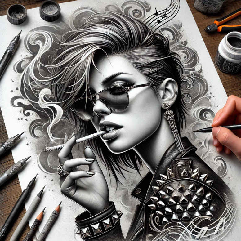 AI-generated tattoo project concept presents a modern black and grey grayscale portrait of a rebellious figure, captured with meticulous shading and bold contrast. The central motif is a man wearing sunglasses, smoking, his hair swept back, and a studded leather jacket. Rendered in a realistic style with careful cross-hatching and smooth gradient transitions, this design balances high-contrast blacks with mid-tones to create a dramatic, timeless look suitable for a large or small surface. The piece invites a range of interpretations, from a tribute to rock icons to a nod to modern urban aesthetics. Symbolically, the cigarette and smoke evoke a fleeting moment and defiance; the sunglasses conceal emotion while the jacket’s studs hint at a guarded persona. The composition supports a cover-up approach, where darker regions can be used to veil older tattoos or scars, while the surrounding negative space provides opportunities for additional elements if desired. This concept is ideal for a custom tattoo design or a standalone piece in Japanese style tattoo or Western noir styling. The black and grey palette ensures longevity and readability on skin, with attention to line weight and shading that translates well to both fine line tattoo styles and more solid, realistic techniques. For potential clients, this design ticks many boxes for meaningful tattoos and body art explorations: it channels a strong urban vibe, can be adapted in size, and offers room for personalization—hair style, eyewear, or jacket details can be adjusted to reflect personal story. As an AI-generated tattoo project concept, it serves as a starting point for collaboration with a tattoo artist to refine linework, texture, and expressive mood, and to ensure the final piece aligns with the wearer’s skin tone and anatomy. In sum, this dark, portrait-based concept embraces black and grey realism, suits cover-up transformations, and embodies a modern take on the tattoo design tradition while remaining adaptable for small or large surface work. The design also aligns with broader tattoo themes such as meaningful tattoos, Japanese or tribal influences, and can be extended into compatible motifs like lotus flower tattoo, infinity tattoo, or rose tattoo design if the client desires, ensuring a cohesive body of ink that honors personal narrative, skin tone, and placement preferences. Its versatility makes it suitable for collaborations on custom tattoo design projects, including small tattoos or expansive back pieces, and it demonstrates how digital AI-generated concepts can inspire traditional tattoo artistry.