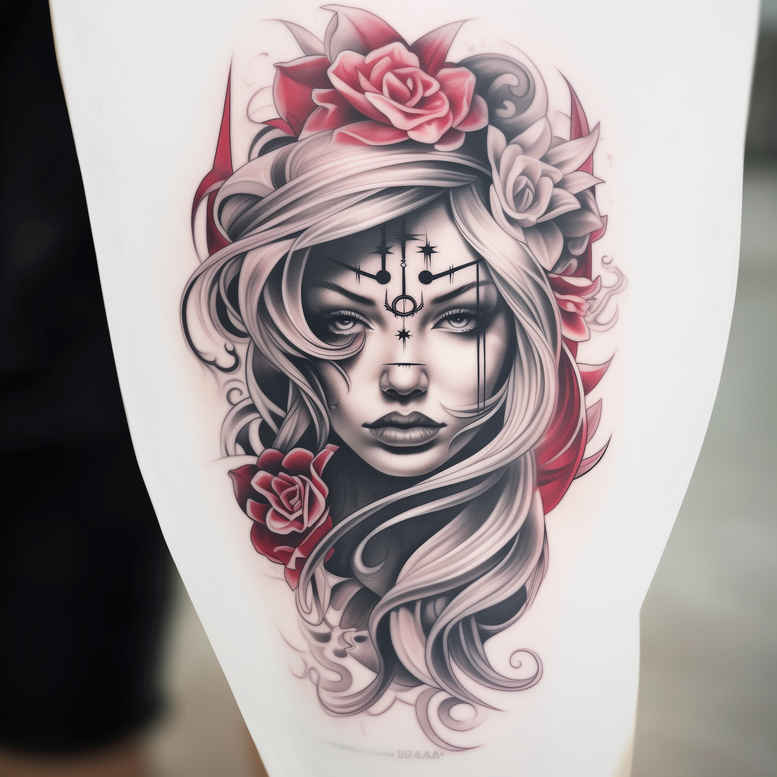 This rose portrait tattoo design presents a striking black and grey realism study centered on a woman’s face, with flowing hair and a crown of crimson roses that surround and frame the features. The piece emphasizes tonal contrasts, from deep graphite shadows to delicate midtones, creating a lifelike skin texture and a sense of movement in the hair. The roses provide a bold color cue within an otherwise monochrome composition, inviting a pop of red that accentuates emotion and symbolism: love, passion, resilience. Executed in a realistic tattoo style, the portrait captures fine line detailing in the lashes, brows, and lips, while broader shading contours the cheekbones and jawline for depth. The crown of roses acts as a natural halo, guiding the viewer’s gaze toward the eyes, which carry a subtle intensity that can be tuned by the wearer. This concept works well as a standalone wearable piece or as part of a larger narrative tattoo design. The techniques implied include smooth gradient shading, careful line work for lace-like jewelry or adornments, and attention to skin tone variations to avoid a flat appearance. For those seeking a meaningful tattoos motif—combining a feminine portrait with floral symbolism—the rose tattoo design offers romance and strength in one compact composition. As an AI-generated tattoo project concept, it can be adapted to different placements, scales, or color accents, and can be refined into a custom tattoo design that aligns with Japanese style influences or more traditional black and grey realism. In print or portfolio contexts, this body art sample showcases how portrait tattoos can balance emotion with botanical elements, making it a good reference for small tattoos or larger back or arm pieces.