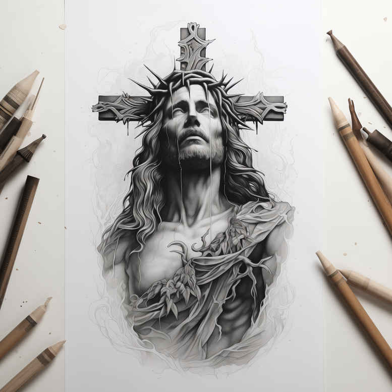 AI-generated tattoo project exploring sacred iconography through a restrained, monochrome portrait of Jesus. The design centers on a lifelike grayscale figure, rendered with soft graphite shading that captures the tenderness and resolve in his expression. The composition folds in a cross silhouette rising behind the head, creating a subtle halo-like focus that elevates the sacred presence without overpowering the wearer’s canvas. The garment drapes with delicate folds, while fine line transitions between light and shadow convey depth and realism. This tattoo design relies on controlled contrast, feathered shading, and precise linework to produce lingering tonal shadows rather than bold blocks of ink. The result is a timeless portrait that can anchor a larger religious sleeve or stand alone as a small, contemplative piece. The piece embraces classic religious iconography while remaining adaptable to contemporary sensibilities, inviting customization in line weight, spacing, and size according to the wearer’s anatomy. The symbolism is deliberate: the figure’s upward gaze embodies devotion and redemption, while the cross behind reinforces faith as a guiding light through trials. The grayscale palette ensures a versatile base that can accommodate future color accents or retouching opportunities, and it invites a broad audience to consider this as a meaningful tattoo design rather than a mere illustration. Such imagery translates well into modern body art, offering a meaningful tattoo that speaks to devotion, sacrifice, and grace. This project draws on a broad vocabulary of tattoo design, including black and grey realism, fine line technique, and reverent composition, making it a strong candidate for a small to medium portrait in both traditional and contemporary contexts. For search visibility, the narrative foregrounds keywords like tattoo, tattoo design, meaningful tattoos, black and grey, realistic tattoo, and ink, while also nodding to variations such as lotus flower tattoo or infinity tattoo for symbolic substitutions. The AI origin note is acknowledged here: while inspired by classical iconography, the artwork is produced as an AI-generated tattoo project to explore design possibilities for clients seeking spiritual imagery in a refined, respectful style.