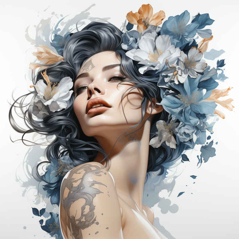 AI-generated tattoo project concept presents a graceful portrait of a woman, elevated by a blue-and-white watercolor flower crown that dissolves into painterly splashes. The composition balances realism in the facial features with soft, flowing botanical motifs, so the viewer experiences a hybrid between illustration and body art. In this concept, the crown of blossoms—cool blues and bright whites—frames the subject’s gaze while delicate linework suggests a fine-line tattoo approach. The watercolor washes create subtle gradients and feathered edges that translate well to skin, offering a timeless aesthetic that can anchor both small tattoos and larger pieces. The color palette emphasizes serenity and depth through blue tones, which suits planning for color ink as well as monochrome translations for a classic look. For tattoo design applications, the symbols of flowers and portrait motifs convey themes of renewal, beauty, and personal identity, making this a meaningful tattoo concept rather than a generic illustration. This description uses modern tattoo language: possible placements include forearm, shoulder, or back, and highlights the flexibility of a floral crown motif to wrap around curves of the body. The piece nods to cross-cultural influences—Japanese-style floral elements, delicate linework, and a hint of realism—while remaining accessible to creators seeking a custom tattoo design with a watercolor vibe. It is an AI-generated tattoo project concept, intended to inspire clients and artists toward refined, meaningful tattoos that celebrate ink as body art. As a concept in tattoo design, it aligns with meaningful tattoos, fine-line tattoo aesthetics, rose tattoo design, lotus flower tattoo, infinity tattoo, tribal tattoo motifs, small tattoos, flower tattoos, custom tattoo design, Japanese style tattoo, black and grey, realistic tattoo, body art, and ink.