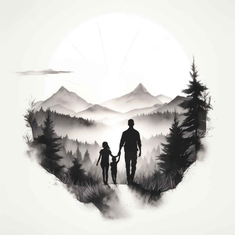 This black-and-grey tattoo concept renders a quiet, contemplative scene where two figures move through a pine-dotted forest toward distant mountains, framed by a heart-shaped negative space created by mist and light. The composition emphasizes bold silhouette shapes, crisp containment, and subtle shading that lends depth without crowding detail, making it a versatile tattoo design for large or medium-sized canvases and a strong cover-up option for darker skin or scar tissue. The focal figures guide the viewer’s eye along a vertical axis, while the surrounding landscape supplies atmosphere: jagged peaks, swaying pines, and a muted sun that glows behind the silhouette, producing a haunting, almost monochrome mood that translates well into black and grey ink. Technically, the piece leans toward a realistic style with a fine-line sensibility; the lines are clean, the shading smooth, and the transitions deliberate, allowing ink to settle evenly on skin and hold over time. The heart motif adds meaning: a pledge, memory, or bond, amplified by the sense of journey implied by the stepping figures. In practice, this tattoo design adapts well to cover-up work because the darkest values are concentrated in the silhouettes and ground, while the lighter mist can be used to blend scar tissue into a natural gradient. This AI-generated tattoo project concept is intended to spark ideas for clients seeking meaningful tattoos and a nature-inspired image with universal appeal. Optional expansions could incorporate lotus flower tattoo elements for new symbolism, infinity tattoo motifs for continuity, or rose tattoo design accents as small symbols along the path, all within a Japanese-style tattoo or tribal tattoo aesthetic if desired, while keeping the core composition intact as a bold, black-and-grey body art ink project.