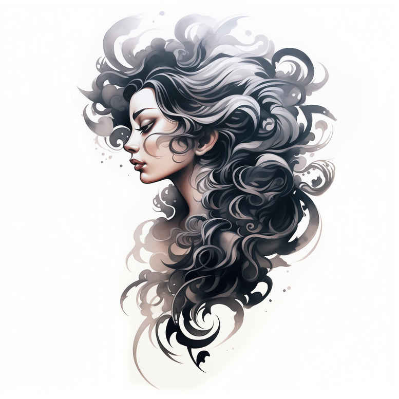 AI-generated tattoo project concept presenting a realistic black and grey portrait of a woman, with voluminous flowing hair that swirls into calligraphic curls. The composition centers on the profile face, capturing subtle shading on the cheek, nose, and lips, while the hair branches into dynamic negative-space shapes that could easily fade into a larger sleeve or back piece. Executed with a softly graded grayscale palette, the design relies on fine line detailing and smooth transitions to simulate depth, light, and texture. The figure’s serene expression contrasts with the kinetic movement of the hair, creating a balanced tension between stillness and motion. While the piece reads as a standalone portrait, it is deliberately adaptable as a cover-up design for clients seeking to rework a prior tattoo into a refined, sophisticated image. The concept aligns with contemporary tattoo design trends favoring realism, black and grey shading, and strategic placement for facial features. From a technique perspective, the piece would be realized with careful stippling and feathered shading, enabling soft transitions that preserve skin texture while maintaining legibility over time. The absence of bold color anchors the work in the realm of black and grey realism, suitable for small to mid-size placements such as forearm, upper arm, or shoulder blade. As a meaningful tattoo concept, it can be interpreted as a meditation on resilience or a tribute to a loved one, given the mournful elegance of a woman’s face and the protective aura of flowing locks. For clients who want a symbolic motif, the hair’s motion can be integrated with subtle florals or script, expanding the design into a larger narrative without compromising the portrait’s clarity. This is an AI-generated tattoo project, illustrating how digital planning can inform precise line work and shading before inking. In terms of keywords, the design fits within tattoo, tattoo design, meaningful tattoos, black and grey, realistic tattoo, body art, ink, and could pair with additional motifs such as lotus flower tattoo, infinity tattoo, or rose tattoo design in a larger composition.
