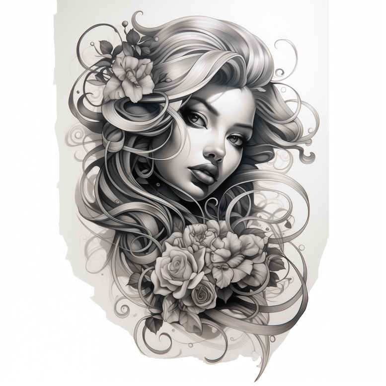 AI-generated tattoo project concept exploring identity and memory through line, shade, and floral geometry. The central figure is a woman’s face rendered in black and grey with flowing hair that curls around a bouquet of roses. The combination of portrait and florals embodies themes of love, resilience, and transformation, making it a meaningful tattoo design for anyone seeking personal symbolism. Executed in a fine line tattoo technique, the piece relies on crisp, continuous lines and smooth grayscale gradients, with selective stippling to create depth without heavy saturation. The roses introduce organic rhythm to the composition, contrasting the controlled precision of the portrait and providing a timeless motif that can be extended into full-sleeve, back, or chest panels or adapted into a small wrist piece. The layout preserves negative space to maintain readability on different skin tones and ages gracefully over time. For cover-up considerations, the grayscale palette and intricate line work lend themselves to concealing existing ink when needed, though the concept also stands well without relying on concealment. Artists can customize expression, hair volume, and floral density to fit client preferences, scale, and anatomical contours. From a marketing perspective, the design aligns with popular tattoo design trends: a fine line style, black and grey realism, and a romantic floral portrait that resonates as a small tattoo or a larger homage to personal meaning. The AI-generated origin signals modern tattoo design workflows, inviting collaboration and refinement in collaboration with a professional tattoo artist, ensuring the final piece expresses authentic body art and personal ink. Because the motif blends human portraiture with botanical ornament, it provides flexibility for different placements, from the wrist to the shoulder blade, and can be simplified for a minimal tattoo or enriched with shading for a dramatic effect. The root symbolism—love, memory, growth—resonates across cultures, enhancing its suitability as a meaningful tattoo for commemorations or personal milestones. This concept also accommodates variations such as adding a lotus flower tattoo element for spiritual symbolism, or integrating a subtle infinity loop around the hair to express timeless continuity. Overall, the design balances accessible readability and artistic nuance, making it a versatile option for those seeking a refined, expressive body art piece. It exemplifies how AI-generated tattoo projects can inform traditional tattoo design processes while remaining fully customizable for individual bodies and skin tones.