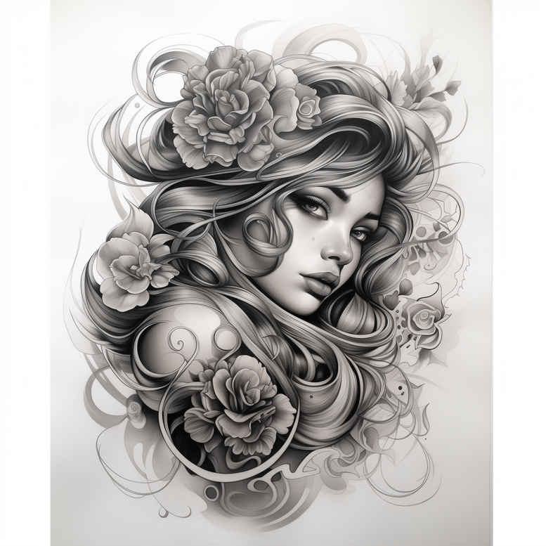 This black and grey portrait study is an AI-generated tattoo project conceived as a versatile, high-contrast template for strong, enduring ink. A lifelike female face emerges from a tangle of roses and curling hair, with precise linework and soft gradient shading that render skin tones and petal texture with convincing realism. The composition balances delicate floral detail with bold shadow, creating depth and a clear focal point that translates well to larger surfaces or simple wraparound placements. The roses symbolize love, memory, and renewal, adding meaning to a portrait-based design that resonates as a personal statement. Technically, the artist blends fine line detailing with broader tonal blocks, letting the portrait breathe while the florals provide a cohesive frame. The floral elements weave around the face and shoulders, enabling a natural flow that works on the upper arm, shoulder blade, back, or chest. As a tattoo design, it sits firmly in black and grey realism, yet the soft transitions between bone-white highlights and shadowed planes give the piece a timeless, adaptable look suitable for small tattoos or extended compositions. For those seeking Japanese style influences, the floral motif can be integrated with lotus, cherry blossom, or wave patterns without breaking the harmony of the portrait. The pattern-like arrangement of petals and curls also offers a modern texture that remains legible in ink and ages gracefully. This concept supports additional motifs such as infinity or tribal accents if desired, expanding into a custom tattoo design tailored to the wearer’s story. Because the image uses dense shading to conceal underlying lines, it can function as an effective cover-up base for clients wishing to transform an older tattoo into a refined, cohesive piece. This is an AI-generated tattoo project, intended as a reference for tattoo artists and clients alike who value a bold yet refined black and grey body art solution, balancing portrait realism with botanical symbolism and long-term ink durability.