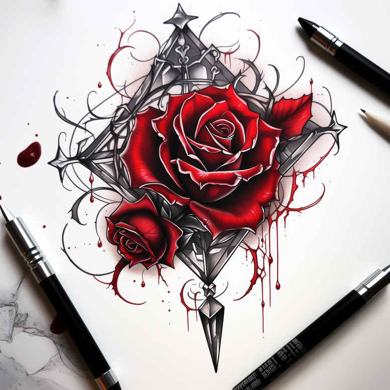 AI-generated tattoo project exploring sacred geometry and floral devotion. At center, a crimson rose unfolds with velvety depth, its petals rendered with soft gradients that mimic natural luster. A diamond-shaped lattice of interlaced lines rises behind the bloom, creating a geometric frame that conveys order, eternity, and the divine. Red accent splashes trace along the edges and thinned gaps, evoking the crown of thorns and the blood of sacrifice, while the surrounding black ink provides a grounded, contemplative mood. The interplay between realistic shading in the rose and the precise, angular geometry creates a dynamic tension that reads as both intimate and monumental when inked on skin. The design embodies a spiritual narrative: beauty and sacrifice intertwined, a visual meditation on Jesus’ message of love, endurance, and redemption. For tattoo enthusiasts, this piece offers a refined path: a strong central motif with a delicate fine line edge, suitable as a standalone work or as part of a larger sleeve built on sacred geometry. The choice of black and grey linework ensures durability and clarity over time, while the red accents bring life and focus to the blossom. In terms of technique, the project leverages high-contrast line weights, soft shading, and careful balance of positive and negative space to ensure legibility at various sizes. As an AI-generated tattoo project, it demonstrates how contemporary design tools can translate timeless iconography into professional ink-ready art that invites personal meaning. Keywords include tattoo, tattoo design, meaningful tattoos, fine line tattoo, lotus flower tattoo, infinity tattoo, tribal tattoo, rose tattoo design, small tattoos, flower tattoos, custom tattoo design, Japanese style tattoo, black and grey, realistic tattoo, body art, ink.