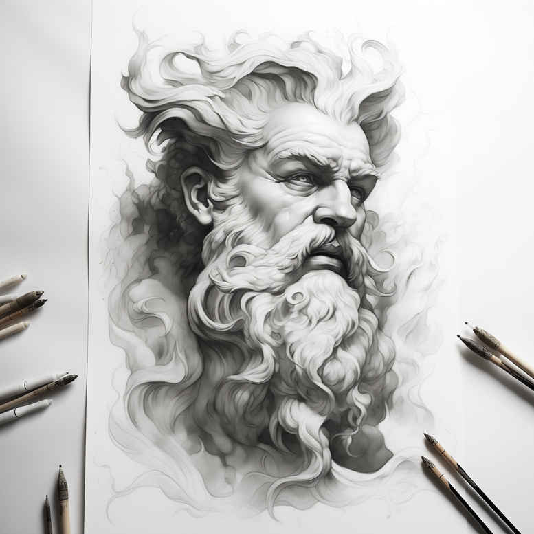 This graphite study presents a grayscale portrait of an elderly bearded man, rendered with meticulous tonal gradation and controlled edge work to evoke the weight of wisdom and time. The central head is modeled with careful anatomy, the brow line and gaze captured with subtle cross-hatching and soft transitions that dissolve into smoky shadows along the cheeks and jaw. A windswept mane frames the face, while a curling beard merges with the surrounding shading to create a cohesive, almost sculptural form. The composition reads well as a tattoo design and can function as a standalone piece or as a focal element in a larger composition; its balance of negative space and dense value creates strong contrast that translates well to skin, making it a solid candidate for a cover-up or a bold black-and-grey realist tattoo. The work demonstrates how a portrait can anchor a broader concept in a custom tattoo design, whether placed on the back, chest, or arm, and invites variations such as pairing with motifs like lotus flower tattoo or rose tattoo design to symbolize growth and resilience, or weaving with infinity tattoo or tribal tattoo motifs to convey continuity and strength. The piece embraces a realistic tattoo grammar with careful line work, soft shading, and crisp highlights that read cleanly in both small tattoos and larger formats, lending itself to Japanese style tattoo sensibilities when combined with bamboo or wave motifs, yet retaining a classic black and grey aesthetic that appeals to fans of fine line tattoo and traditional realism. In keeping with the evolving field of AI-generated tattoo projects, this concept demonstrates how a lifelike portrait study can be transformed into a meaningful body art commission, with ink-based outcomes that honor the original drawing while enabling personalized symbolism and stylistic adaptation.