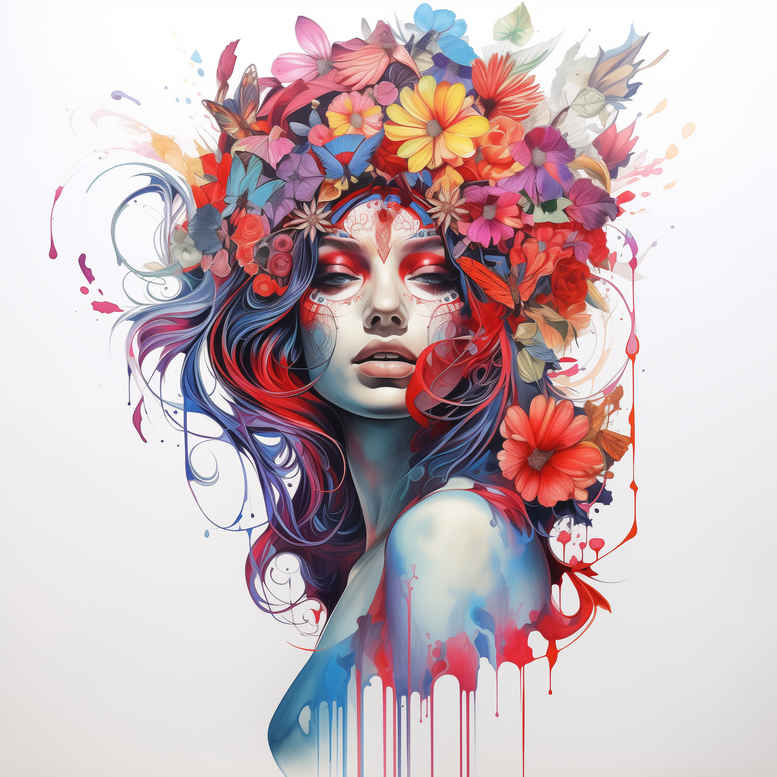 AI-generated tattoo project concept presented as a watercolor floral portrait, balancing realism and painterly abstraction. The composition centers on a woman’s face rendered with careful shading and selective contrast, framed by a crown of blossoms that floats above the head and bleeds into color washes and dripping accents. The technique emphasizes delicate line work for facial features and stems, with bold bursts of color that simulate ink depth and saturation. The crown’s botanicals—roses, daisies, and tropical blooms—offer symbolic meanings of growth, renewal, and the beauty of change, while the overall silhouette reads as a versatile tattoo design suitable for meaningful tattoos across placement options such as the forearm, upper arm, or shoulder. While the concept is AI-generated, it translates effectively into a custom tattoo design with a strong graphic identity and a readable negative space that supports future line refinement in a fine line tattoo. The palette leans bright and luminous—pinks, purples, teals, and warm skin tones—yet the piece can be pared back into black and grey for a more timeless, realistic tattoo aesthetic if desired, aligning with black and grey traditions; this flexibility makes it a robust reference for flower tattoos, small tattoos, and Japanese style tattoo influences. The work also nods to contemporary watercolor tattoo techniques, where soft gradients, crisp outlines, and color bleeds are balanced to maintain longevity on skin and to translate well in ink, while variant executions can emphasize floral motifs or even integrate infinity or lotus-inspired accents for personalized symbolism. In sum, the artwork embodies a modern tattoo design language that speaks to meaningful tattoos and the enduring appeal of body art; it serves as a strong starting point for a commission, a refined cover piece, or a collaborative concept that honors both traditional tattoo vocabularies and innovative ink artistry.
