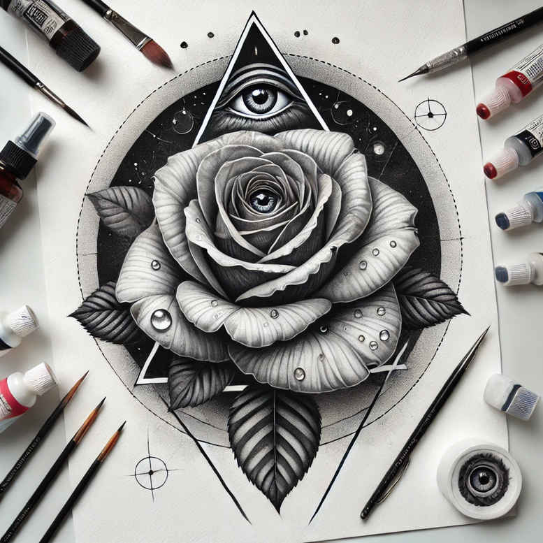 AI-generated tattoo project presented as a cover-up-ready study, featuring a rose and an all-seeing eye embedded in a geometric diamond frame. Rendered in black and grey realism, the piece balances organic petals and leaves with precise polygonal facets, creating a strong focal point while preserving soft shading transitions. The rose symbolizes beauty and resilience; the eye suggests vigilance and inner strength, with the diamond frame offering structure and a modern graphic edge. The technique emphasizes fine line detailing in the petals and leaves, smooth gradient shading for tonal depth, and crisp line work for the diamond facets, producing a cohesive composition that scales for forearm, shoulder, or back placements. The design intentionally exploits dark value areas to enhance coverage, making it an effective option for cover-up projects where existing ink must be masked while maintaining legibility of the central motifs. By adopting a primarily black and grey palette, the tattoo design achieves high contrast and timeless longevity, while the geometric geometry nods to contemporary tattoo trends. This concept aligns with meaningful tattoos exploring balance between nature and geometry, and with ink that works well as a small to medium-sized piece, or as the centerpiece of a larger sleeve. As an AI-generated tattoo project, it demonstrates how classic symbols can be reimagined through modern pattern work and realistic shading, appealing to clients seeking a durable, symbol-rich cover-up or standalone tattoo design. The narrative anchors rose symbolism with resilience, while the all-seeing eye adds vigilance; together they offer a compelling story for body art lovers. Keywords such as rose tattoo design, fine line tattoo, black and grey realism, and flower tattoos are embedded to support discoverability, while keeping the prose coherent and connected to quality ink and meaningful tattoos.