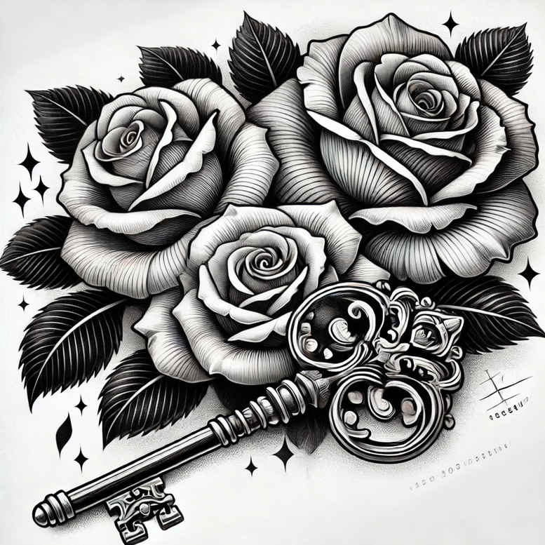 This tattoo design presents a black and grey realism composition centered on two lifelike roses interwoven with an ornate vintage key. The carefully calibrated gradients, cross-hatching, and fine line work render delicate petals, serrated leaves, and the key’s filigree with astonishing depth, ensuring the piece remains legible at smaller sizes while delivering impactful impact on larger canvases. The roses symbolize love, memory, and resilience; the key represents access to hidden truths or a guarded heart, a pairing widely used in meaningful tattoos. Surrounding stars and subtle negative space contribute a spellbinding contrast that guides the eye toward the central motif and creates natural motion across the skin. The pattern-like filigree around the key adds an architectural, decorative touch—an element that doubles as a built-in pattern, elevating the design from a simple botanical piece to a sophisticated cover-up-ready concept. The overall composition is designed with versatility in mind, suitable for placement on the forearm, upper arm, or calf, and intended to pair well with existing ink when used as a cover-up. The style leans toward black and grey realism while incorporating fine line accents to enhance texture without crowding the negative space. In terms of technique, the artist would employ smooth shading gradients, crisp linework for the key’s curls, and a restrained stipple or feathering approach to ensure longevity of the black ink. From a branding and search perspective, this tattoo design aligns with terms like rose tattoo design, lotus flower tattoo, infinity tattoo, tribal tattoo, small tattoos, flower tattoos, custom tattoo design, Japanese style tattoo, and realistic tattoo, all while remaining accessible as a stand-alone piece or as part of a larger body art project. If the wearer is seeking a discreet, yet deeply symbolic piece, this concept offers excellent cover-up potential for older dark ink, thanks to its bold silhouettes and layered shading. Note: this is an AI-generated tattoo project concept.