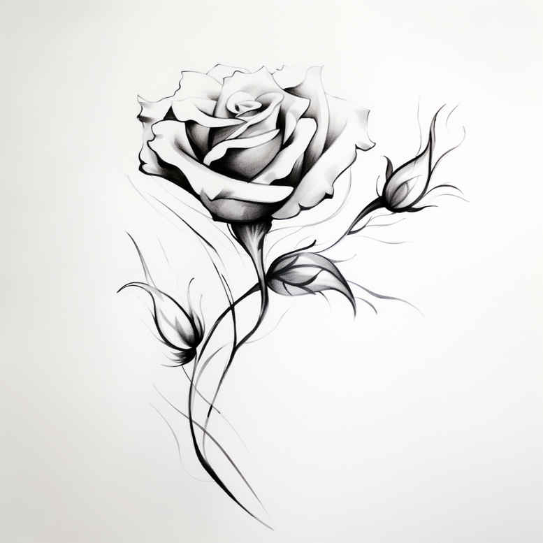 This composition presents a refined black and grey rose tattoo design rendered in delicate fine lines. The central blossom curves upward with softly layered petals, while a slender stem threads beneath and splits into curling tendrils that balance the composition. Leaves arch along the stem in a restrained rhythm, creating a cohesive vertical motif that works well on the forearm, calf, or ribcage. The technique privileges line economy: precise, threadlike lines define the petals and sepal edges, and subtle gray shading builds depth without overpowering the airy feel of the sketch. This concept reads as both a standalone study and a flexible foundation for a custom tattoo design that can be scaled up or refined to suit a client’s anatomy. In terms of symbolism, the rose often represents beauty, resilience, and new beginnings, while the thorny accent hints at guarded emotions and the selective nature of growth. A black and grey palette emphasizes timeless elegance and ensures strong contrast against a range of skin tones, making the piece adaptable to different body areas. As an AI-generated tattoo project, it demonstrates a clean, scalable silhouette that can be transformed into a final tattoo by a seasoned artist, preserving the integrity of the fine line aesthetic. Though primarily botanical, the motif can be harmoniously paired with other themes such as lotus flower tattoo elements, infinity tattoo motifs, or subtle tribal ink for a larger narrative. For collectors and first-timers alike, the piece offers a quiet statement—small enough for discreet placement yet rich in meaning—while remaining faithful to the long tradition of rose tattoo design, black and grey realism, and the broader spectrum of ink artistry.