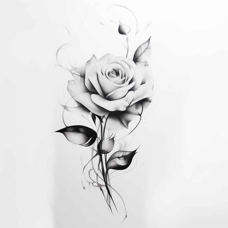 This black and grey rose tattoo design presents a slender, highly detailed bloom with a curling stem and select leaves rendered in smooth shading. The composition emphasizes natural form over heavy geometry, lending a classical feel suitable for a refined backdrop on the forearm, rib, or shoulder. The rose is captured in monochrome tonal values, with soft transitions from near-black shadows to pale highlights, creating depth and a lifelike impression within a minimal line framework. The design reads as a single botanical motif that can function as a standalone piece or serve as a strong cover-up element for smaller or older tattoos, thanks to its shaded petals and elongated stem that can be extended or integrated with additional blossoms if needed. Technique-wise, the rendering leans toward realistic tattoo aesthetics translated from graphite drawing: careful edge control, subtle gradient shading, and crisp silhouette while maintaining a delicate, fine-line impression. The visible elements include the rose blossom, a twisting stem, and several leaves, all portrayed in black and grey tones; the result is a flexible idea for tattoo design that can be adapted to different sizes and placements. In terms of symbolism, the rose conveys beauty, resilience, and transformation, while the spine-like stem hints at growth and connection. This concept aligns with meaningful tattoos, offering a timeless option within black and grey realism, and it can be tailored to styles such as Japanese-inspired or more conventional Western botanic ink. AI-generated tattoo project note aside, this concept balances elegance with wearability, inviting customization into a personal narrative of ink, style, and body art.