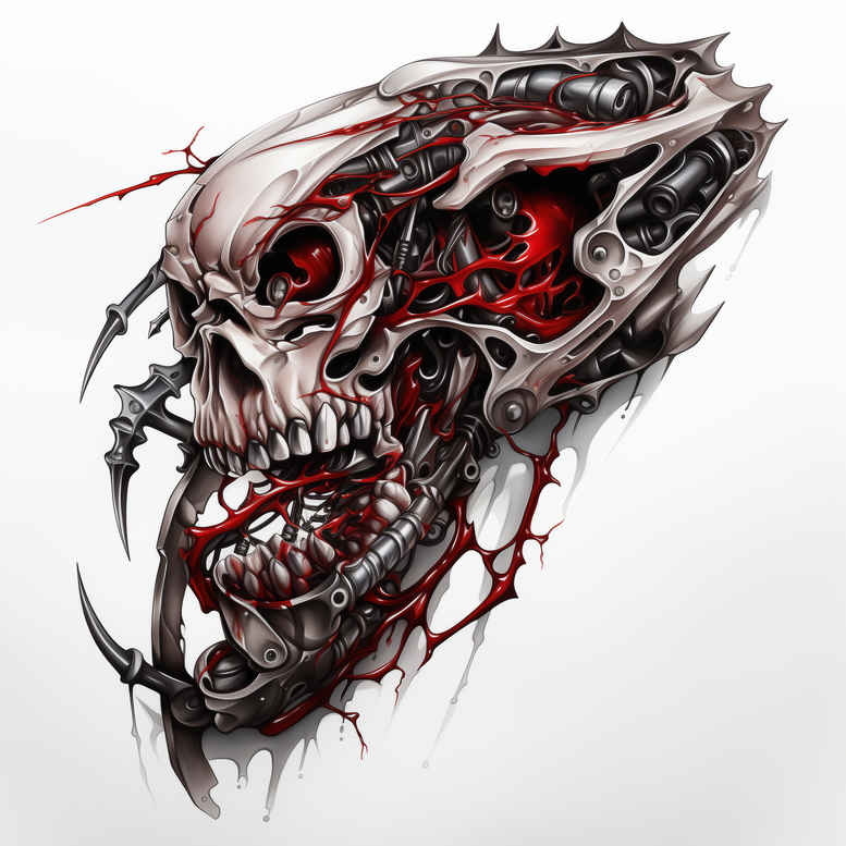 AI-generated tattoo project concept presented as a biomechanical skull rendered in black and grey with selective crimson accents. The composition centers on a detailed skull whose eye sockets, teeth, and nasal area merge with interlocking gears, cables, and fractured plating, all executed with smooth gradients, crisp line work, and subtle stippling to suggest metal, bone, and sinew. The result is a hybrid of realism and graphic machinery, where organic contours meet mechanical texture in a high-contrast composition. Dense shading and negative space create a powerful silhouette that remains legible on smaller canvases yet makes a bold statement on larger surfaces. Given its heavy black work and intricately patterned motifs, this concept is especially suitable for a cover-up, capable of concealing previous ink beneath a new, darker image while guiding the eye through the jawline and temple. The machinery motifs can flow into sleeves or back pieces, with the gears acting as a unifying motif for adjacent panels. The red accents serve as a controlled focal point without overpowering the grayscale foundation. Technique-wise, the design favors black and grey realism with precise outlines, layered shading, and texture to simulate steel, bone, and worn mechanisms. As a tattoo design concept, it supports customization for placement, scale, and motifs, and can be adapted to variations such as lotus flower tattoo or rose tattoo design if a different symbolic direction is desired. This is an AI-generated tattoo project concept, illustrating how graphic patterns and biomechanical elements can yield a striking, cover-up-friendly body art piece. Keywords include tattoo, tattoo design, meaningful tattoos, fine line tattoo, black and grey, realistic tattoo, body art, ink, and pattern.
