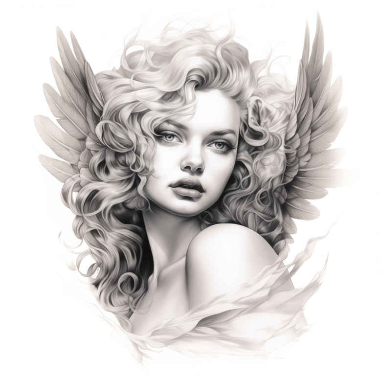 This concept presents a winged female portrait rendered in grayscale, designed as a versatile tattoo idea that blends realism with classical symbolism. Executed with soft shading and precise line work, the piece centers on a poised woman whose calm expression is set against a backlit pair of feathered wings, suggesting flight, transformation, and guardianship. The grayscale palette creates strong contrast between pale skin tones and deep blacks, delivering depth and a timeless feel that reads clearly as black and grey ink. The wings exhibit intricate feather textures, while the facial features are subtly modeled to preserve a cinematic, ethereal quality that remains legible as the ink ages. This is an AI-generated tattoo project intended for a refined, realistic approach; it adapts well to larger canvases such as the back or shoulder while remaining scalable for smaller placements. Symbolically, the winged figure can embody growth, resilience, and protection, making it a meaningful tattoo design for individuals seeking personal narratives. For variations, the concept can incorporate floral elements, Japanese style influences, or a delicate infinity motif along the spine or shoulder blade to enhance storytelling. The overall mood is elegant and contemplative, appealing to those pursuing meaningful tattoos with a classic, enduring appeal, and it offers options for a cover-up if needed without sacrificing character. In practice, this winged portrait design demonstrates how a portrait tattoo design can function as body art that fuses realism with symbolic storytelling, refined ink technique, and flexible composition. Technique notes include gradual gradient shading, micro-shading, subtle cross-hatching, and occasional stippling to suggest soft value changes in the feathers and hair, ensuring durability and readability over time.