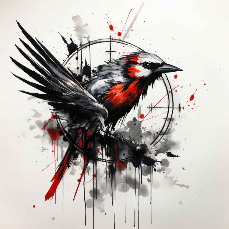 This is an AI-generated tattoo project featuring a watercolor bird in flight, rendered in black, grey, and red inks with expressive splashes. The composition centers on a bold avian figure whose feathers are rendered with loose, kinetic strokes that mimic watercolor bleed, while fine line work defines essential details. Behind the bird, a circular motif intersects a cascade of ink splatters, creating graphic patterning that contrasts with the natural movement of the plumage. The color palette—deep black, cool greys, and vivid red accents—establishes a strong silhouette suitable for a dramatic tattoo design, yet the grey washes soften transitions for a more painterly feel. Symbolically, the bird evokes freedom, resilience, and renewal; the circle can symbolize continuity or life cycles, and the red accents inject energy and focus. The splatters function as texture that will age gracefully with time, helping to blend the piece into existing skin work if used as a cover-up. This concept is easily adaptable to placement on the shoulder, upper arm, forearm, or back, and can be scaled from a small capstone piece to a larger statement tattoo design. From a technique standpoint, expect a layered approach: a wash-driven background, crisp feather details with delicate line work, and selective saturation of red to draw the eye. The artwork is true to watercolor tattoo principles, and while it leans into a bold graphic presence, it also embraces subtle nuance that can be tuned to individual skin tones. As an AI-generated tattoo project, it demonstrates how custom tattoo design can combine modern illustration with traditional body art, resonating with keywords such as tattoo, tattoo design, meaningful tattoos, fine line tattoo, lotus flower tattoo, infinity tattoo, tribal tattoo, rose tattoo design, small tattoos, flower tattoos, custom tattoo design, Japanese style tattoo, black and grey, realistic tattoo, body art, and ink. Because of the dense dark areas and the ability to rework prior tattoos, it is particularly well-suited for cover-up work. Graphic pattern elements like the circular motif and splatter provide an anchor for reworking existing tattoos.