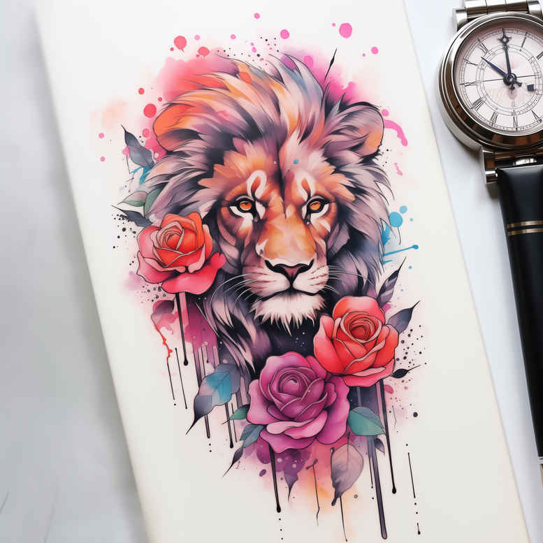 This tattoo concept presents a powerful lion portrait interwoven with pink and purple roses in a vibrant watercolor aesthetic. The composition places the lion’s head as the focal point, with blooms framing the mane and subtle leaves spilling along the edges, creating a lively balance between animal portraiture and botanical motif. The technique blends soft washes with crisp linework: the lion’s features are defined with fine detailing for realism, while the surrounding color sprints bleed into each other, producing the signature drips and halos of watercolor tattoos. The color palette emphasizes warmth—amber, gold, and burnt orange on the lion—complemented by pink and magenta roses and fresh greens for the foliage. This approach lends a dynamic sense of motion, as if the scene is painted directly on skin. The piece can be adapted to various canvases, from forearm to upper arm or back, depending on scale. Symbolically, the lion conveys courage and leadership, paired with roses to soften the ferocity and symbolize love and growth; together they tell a meaningful tattoo narrative about strength tempered by beauty. For tattoo design versatility, the concept remains highly customizable: line thickness, bloom size, and the amount of negative space can shift the mood from bold realism to a more delicate, fine line tattoo style. From a production perspective, the watercolor technique relies on controlled bleeding and layering, building depth without heavy shading, while preserving a vibrant, contemporary feel. This AI-generated tattoo project concept showcases how illustration, color theory, and symbolic iconography translate into a stylish body art piece; for color lovers, it’s a compelling alternative to black and grey incarnations and can easily be adapted to a full-color palette. If desired, a monochrome rendition in black and grey can be produced to honor tradition, while retaining the same composition elements such as rose accents and the lion’s expression. Keywords: tattoo, tattoo design, meaningful tattoos, fine line tattoo, rose tattoo design, flower tattoos, custom tattoo design, body art, ink.