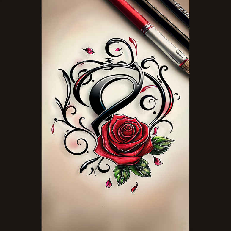 This tattoo design presents a vivid red rose anchored by an expansive field of black scrollwork, a study in contrast where color and linework meet to form a decorative floral centerpiece. The rose is rendered with layered shading to create a lifelike depth in the petals, highlighting a natural gradient from crimson to burgundy, while the green leaves provide a bright counterpoint. Surrounding the blossom, sweeping tendrils and filigree curl in bold black, creating a dynamic pattern that intertwines with the bloom rather than competing with it. This pattern-heavy composition blends elements of realism with ornamental tattoo design, achieving a look that can anchor a larger body of work or function as a striking standalone piece. The motif recalls traditional floral tattoo design, yet the crisp linework and careful shading give it a modern edge, suitable for lovers of flower tattoos, rose tattoo design, and custom tattoo design. The balance of positive and negative space ensures readability on the skin across sizes, making it versatile for placements from shoulder to forearm. The image demonstrates how AI-generated tattoo projects can explore motif variations before finalizing a commission; the concept emphasizes meaningful tattoos—beauty, resilience, and growth—through the universal symbol of the rose, while the surrounding black scrolls hint at infinity and continuity. In short, this full-color concept bridges floral realism with graphic pattern, offering a bold, eye-catching option for anyone seeking a memorable tattoo that remains legible in both detail and scale.