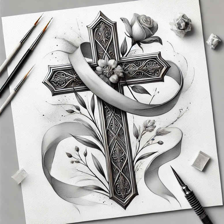 Presented as an AI-generated tattoo project, this concept features a Gothic cross wrapped in ornamental filigree, framed by curling ribbon and stylized leaves rendered in black and grey. The composition blends bold line work with nuanced shading to create depth within a timeless religious motif, making it adaptable for placement on the arm, back, or chest. The cross is segmented into panels with cathedral tracery-like detailing, while surrounding leaves and ribbon impart movement and balance, enabling easy adjustments to scale or line density for customization. Symbolically, the cross acts as an anchor of faith and endurance, with the botanical elements suggesting growth, transformation, and renewal. Executed in a fine line black and grey palette, the design relies on high contrast and controlled shading to maintain clarity as it ages, offering strong readability for both small tattoos and larger compositions. The piece leans toward a realistic tattoo sensibility while retaining an illustrative edge, making it suitable as a single standalone work or as part of a larger body of work that could reference Japanese style tattoo or tribal tattoo motifs, depending on client preference. For someone seeking a meaningful tattoo design with a classic yet contemporary vibe, this concept provides versatility: it can be rendered with crisp, dense shading for a bold statement or softened with lighter gradients for a more subtle effect. In cases of very dark skin tones or existing ink, the high-contrast blackwork approach supports visibility and longevity, reinforcing its suitability as a cover-up option. The design can be easily extended into related themes such as a rose tattoo design, lotus flower tattoo, or infinity tattoo, emphasizing flowers and botanical symbolism within a cohesive cross-centered composition. This exploration demonstrates how AI-driven concepts can translate into tangible tattoo ideas, underscoring the potential of custom tattoo design to merge traditional symbolism with current trends while remaining portable across ink mediums. Note that while this is an AI-generated tattoo project, it presents a viable foundation for clients who want a refined Gothic cross motif with botanical accents, capable of adaptation for small tattoos or larger pieces, and adaptable to Japanese style tattoo or black and grey realism choices, ensuring a durable, timeless body art result.