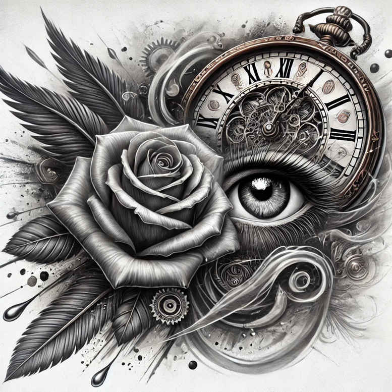 This AI-generated tattoo project concept presents a cohesive black-and-grey composition where a blooming rose anchors the foreground, while a watch face and scattered gears carve an industrial track across the canvas. An eye, seemingly peering through the mechanism, centers the composition and adds a sense of watchful meaning. A wing arcs overhead and a single feather traces the lower edge, providing organic contrast to the machinery and creating a dynamic diagonal flow. The shading is densely layered, employing fine-line technique, smooth gradients, and selective stippling to achieve a realistic tattoo look with rich texture in petals, metal, and fabric-like wing feathers. Each element is carefully scaled to maintain a balanced silhouette readable in a small tattoo and impressive in a larger piece. Symbolically, the rose stands for resilience and beauty; the eye suggests perception and memory; the watch denotes time, fate, and the passage of moments; the gears reflect the complexity of life and personal systems; the wing implies freedom and aspiration. The overall motif blends natural life with engineered precision, a common theme in modern Japanese-inspired and black-and-grey realism tattoos. This design is suitable for tattoo design enthusiasts seeking meaningful tattoos with a refined aesthetic, including fine-line tattoo and flower tattoos styles, while remaining adaptable to a custom tattoo design approach. As a concept, it invites tailoring of line weight, shading depth, and scale to suit body placement, from small forearm ink to full chest panels, ensuring compatibility with both traditional and contemporary body art sensibilities. Given the predominantly dark shading, this piece is especially well-suited as a cover-up design, capable of concealing older marks while preserving a striking narrative aura. In short, the rose, watch, eye, and gear imagery coalesce into a timeless, meaningful tattoo design that blends realism, symbolism, and technical finesse for ink enthusiasts. This is an AI-generated tattoo project concept intended for professional refinement by a tattoo artist; final execution should adjust to individual anatomy, skin tone, and placement. The description intentionally emphasizes black and grey realism, fine-line precision, and the potential for a classic rose tattoo design fused with mechanical elements, delivering a durable, legible ink suitable for both small tattoos and larger body art.