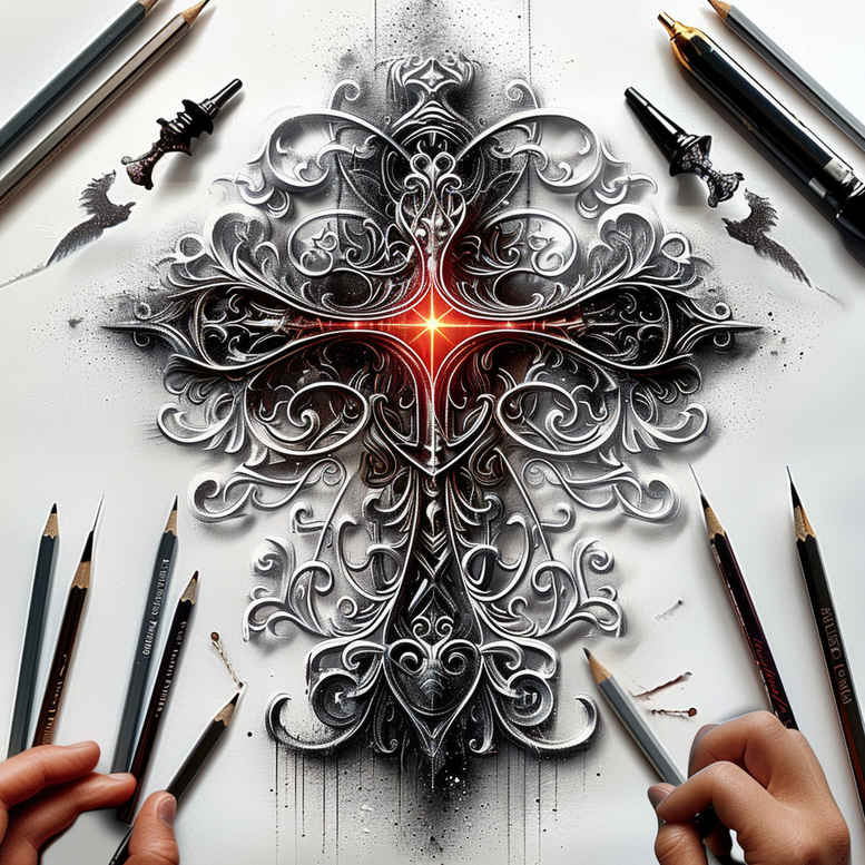 This image presents a dark, meticulously crafted cross design, rendered in black and grey with dense ornamental filigree that forms a reflective rosette at the center. The surrounding workspace shows pencils and hands guiding the sketch on paper, signaling this is a tattoo design concept in progress. The central motif is a cross forged from scrolling tendrils, knots, and fine line details that converge at a crimson glow, suggesting energy rather than color, and reinforcing the piece as a study in shade, contrast, and line weight. The pattern-rich surface evokes Baroque and Celtic influences, creating a graphic tapestry rather than a simple emblem, with hints of tribal tattoo aesthetics through bold structure and negative space. Although the piece reads as a bold statement, its fine line technique allows precise shading and delicate contouring, making it adaptable for a small placement or larger back or chest work. In terms of meaning, the cross can symbolize faith or balance, while the surrounding filigree references growth, protection, and continuity, with the negative space offering breathing room that sharpens the overall impact. The frame-like symmetry lends itself to Japanese style tattoo motifs, while the black and grey palette anchors a classic, timeless aesthetic suitable for a wide range of clients seeking a meaningful tattoo design. As an AI-generated tattoo project, the image is intended as a concept draft rather than a finished commission, inviting collaboration with an artist to fine-tune line density, needle configuration, and placement. For coverage, the dense dark shading and complex pattern make it an excellent candidate for cover-up work, particularly when incorporating existing scars or tattoos into the new composition. Readers will notice a focus on small-to-medium scale decoration that remains legible from a distance and reveals intricate details on closer inspection. The piece exemplifies how a highly structured pattern can carry emotional weight—an ideal candidate for a meaningful tattoo design such as a lotus flower tattoo or an infinity tattoo motif integrated into the cross, perfect for those seeking meaningful tattoos and custom tattoo design.