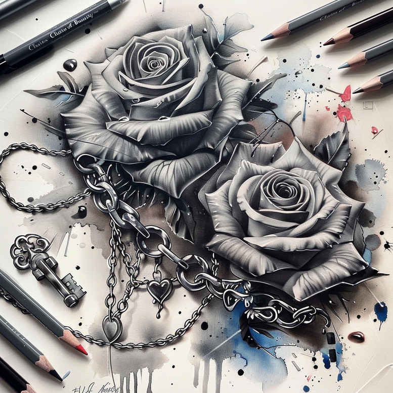 An AI-generated tattoo project concept in grayscale, this design centers on two lifelike roses entwined by a metallic chain and anchored by a vintage key pendant. The blooms are rendered with careful shading: velvety petals fade from near-black at the inner folds to lighter greys along the outer rims, giving a sense of depth and organic texture. The chain loops around the blossoms with believable weight, each link catching subtle reflections that add realism without overpowering the floral forms. A small key rests at the base, its bow and teeth detailed with fine line work to contrast against broader shading. The composition balances soft gradient transitions with crisp line details, producing a realistic tattoo aesthetic that works beautifully as a standalone piece or as part of a larger sleeve. Monochrome ink reinforces timeless appeal, while the grayscale palette keeps the piece versatile for placements like forearm, shoulder, or chest. The symbolism—rose for beauty and resilience, chain for connection or constraint, key for memory and opportunity—lends meaning suitable for meaningful tattoos and rose tattoo design enthusiasts. It can be extended with Japanese style influences, tribal elements, or additional floral motifs, yet stays true to the black and grey realism tradition, ideal for small tattoos or larger body art. Because the image is intentionally dark, this concept is especially effective as a cover-up design, offering dense shading that can mask previous ink while preserving texture and depth. AI-generated tattoo project.