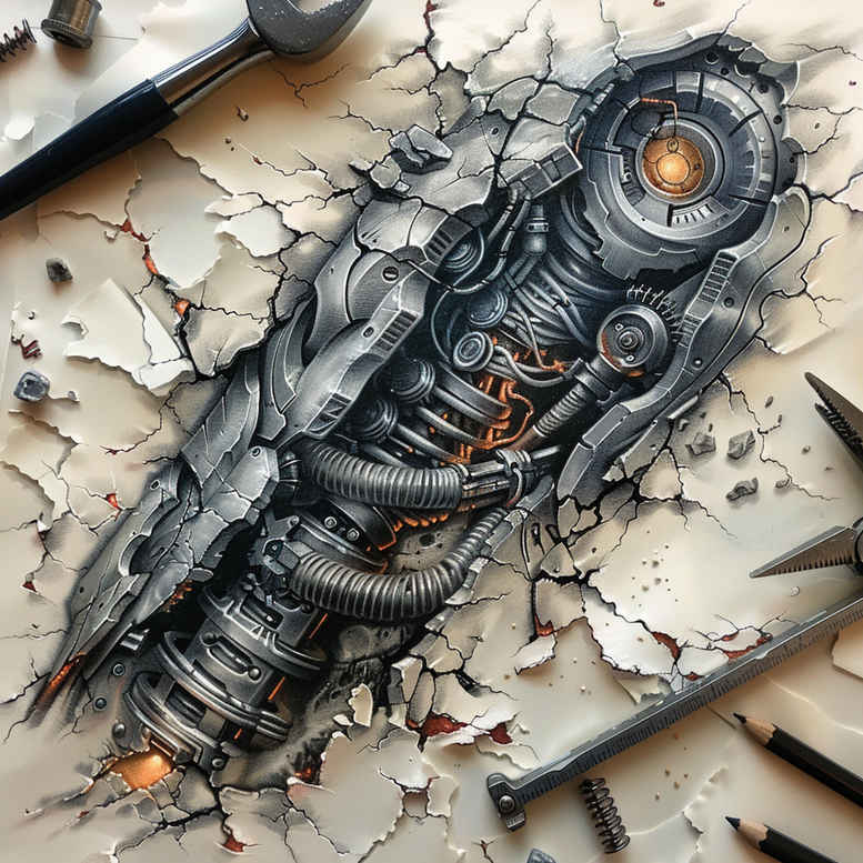 This concept depicts a gun-shaped mechanical form rendered in black and grey with an orange energy core. The piece is an AI-generated tattoo project that fuses realism with industrial motifs, creating a bold statement about resilience and transformation. The elongated silhouette is studded with gears, pistons, tubes, and riveted plates that read like a machine built for motion and protection. Dense shading and smooth gradients create convincing metallic textures, while selective highlights convey the glow of the orange core. Pattern-rich elements—interlocking cogs, lattice textures, and exposed circuitry—provide rhythm and depth, ensuring a cohesive design that can anchor a large canvas such as the back or forearm, or function as a striking centerpiece in a sleeve. From a tattoo design perspective, the work blends realism with mechanical fantasy, combining black and grey ink with precise line work and touches of Japanese precision in the detailing. The visual language speaks to meaningful tattoos for people drawn to strength, transformation, and resilience; the core symbolizes inner energy, while the surrounding gears echo cycles of life and growth. This concept supports a custom tattoo design approach, inviting adjustments in scale, line weight, and placement to suit individual anatomy and story. For cover-up purposes, the dense tonal range and pattern-driven structure allow skilled artists to camouflage existing ink while preserving a bold silhouette. The AI origin note emphasizes digital concepting, yet the final tattoo design adheres to body art realities and ink aging considerations, delivering a durable black and grey result with a dramatic orange accent that catches the eye. This pattern-forward composition also makes it adaptable to different bodies and pain thresholds, offering options for micro-detail on smaller areas or expansive realism on larger surfaces. It remains compatible with a range of styles, from fine line tattoo refinements to bold, high-contrast shading.