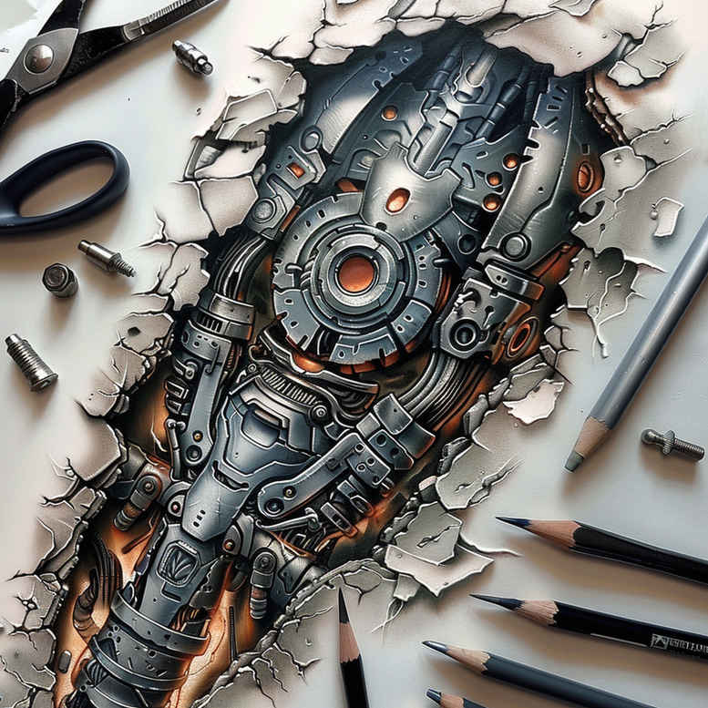 As an AI-generated tattoo project concept, this cover-up-ready forearm design merges biomechanical anatomy with industrial gears rendered in black and grey. The flowing composition traces a forearm path where interlocking plates, pistons, and tubing read as a living machine, with meticulous line work and soft gradient shading that create depth and a convincing metal texture. Torn paper edges frame the piece, suggesting a revealed inner mechanism and a deliberate transition from surface ink to concealed meaning. The design works as a bold centerpiece for those seeking meaningful tattoos that can cover scars, previous ink, or blemishes while delivering a striking statement in body art. The look leans toward realism, with careful attention to light reflection on metal, micro-hatching for texture, and crisp outlines that maintain legibility as the forearm moves. While grounded in black and grey, the concept is adaptable: it can be refined into a fine line tattoo for a subtler effect, expanded into larger Japanese style tattoo influences, or fused with rose tattoo design or lotus flower tattoo motifs, infinity tattoo symbols, or tribal tattoo accents to tailor meaning for the wearer. Its graphic pattern of gears and circuits provides a versatile base for customization, whether you want a purely mechanical aesthetic or an emotional narrative linking engineering to identity. Because the image emphasizes a dark palette and a dense composition, it is particularly well-suited as a cover-up solution, capable of concealing older ink beneath a powerful new design. This AI-generated tattoo project offers a strong starting point for a bespoke commission, inviting collaboration with a tattoo artist to adapt scale, shading, and motifs to the client’s skin tone, placement, and personal symbolism. In sum, the concept embodies strength, transformation, and modern body art storytelling, while remaining highly practical for clients seeking meaningful tattoos, small tattoos, or larger inked statements, and a custom tattoo design that can be rendered with ink on skin across various styles.