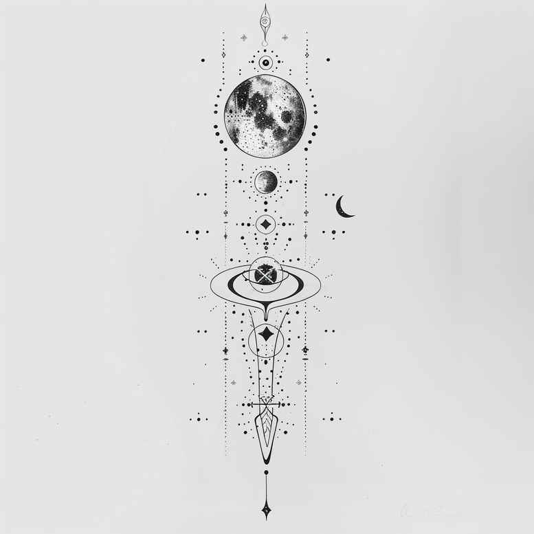 This tattoo design presents a vertical, geometric composition built from a sequence of celestial and geometric motifs rendered in black and grey. At the apex, a detailed moon portrait sits within a circular frame, anchoring the piece with quiet luminance. Descending from this focal point, concentric rings and slender lines extend downward, forming a precise axis that organizes smaller elements into a measured symphony of shape and space. Along the shaft, dot clusters create negative-space gradients, while repeated crescents and triangles introduce rhythm and balance. The overall effect is a micro-chemistry diagram translated into skin art, a study in line quality, spacing, and rhythm. As a fine line tattoo with dotwork, the piece relies on delicate strokes rather than heavy shading, making it suitable for subtle, long-term wear. The moon evokes cycles, change, and contemplation; the circles signify unity and continuity; the lines imply direction and restraint; the crescents hint at phases and growth; the triangles offer precision and tension. Together they form a cohesive tattoo design that reads as a constellation of small symbols rather than a single large image, allowing for flexible placement along the forearm, spine, or ankle. For collectors of meaningful tattoos and fans of geometric geometry, the concept can branch into a larger sleeve or remain a compact study in black and grey ink. It complements lotus flower tattoo ideas, infinity tattoo motifs, and rose tattoo design concepts, and it can be adapted into a custom tattoo design with subtle shading or preserved as crisp black and grey linework. AI-generated as an imaginative tattoo project concept, this design demonstrates how clean linework and pattern-based composition can translate into body art with lasting clarity, while preserving versatility for small tattoos or larger geometric explorations.