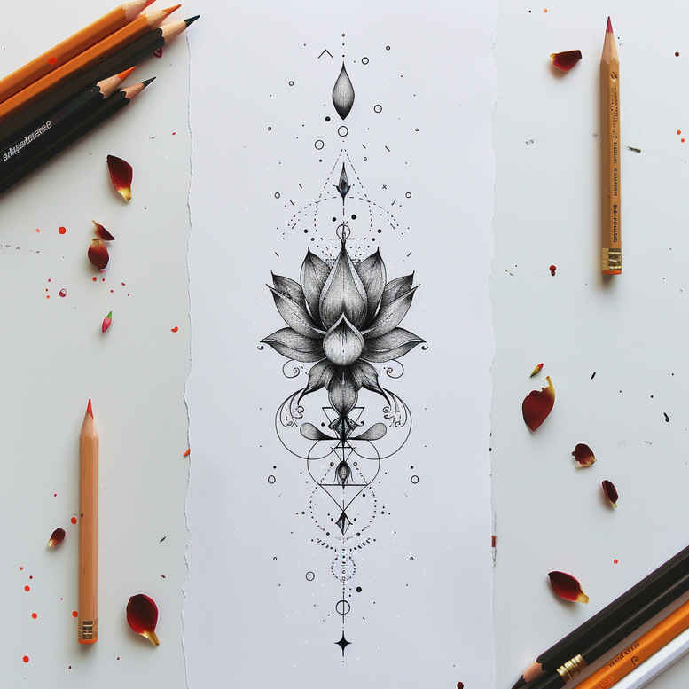 This AI-generated tattoo project presents a refined fine-line lotus mandala tattoo design rendered in black and grey. The central motif features a lotus flower embraced by a precise mandala of concentric petals, geometric lines, and delicate dotwork that radiates along a vertical axis. The execution emphasizes clean line weight, balanced spacing, and restrained shading to create a wearable image with legible detail over time. The interplay of negative space and stippled textures gives depth without compromising clarity, a hallmark of modern fine-line tattoo technique. Symbolically, the lotus suggests purity and spiritual awakening, while the mandala conveys balance, wholeness, and intention—traits many seek in meaningful tattoos. The composition also carries potential for various interpretations, from a Japanese-style refinement to a contemporary geometric aesthetic, and it translates well as a small tattoo on the wrist, forearm, or behind the ear. The palette remains black and grey, ensuring timeless contrast against diverse skin tones, with the option to adapt shading or line density for personal preference. The surrounding workspace in the shot—pencils, leaves, and a crisp sheet—frames this as a concept sketch and a ready-to-ink idea for a client. As a concept piece, it adheres to professional tattoo design standards, offering scalable elements and symmetrical precision that a custom tattoo design can reproduce faithfully. For SEO and discoverability, the narrative weaves in terms like tattoo, tattoo design, meaningful tattoos, fine line tattoo, lotus flower tattoo, infinity tattoo, tribal tattoo, rose tattoo design, small tattoos, flower tattoos, custom tattoo design, Japanese style tattoo, black and grey, realistic tattoo, body art, and ink, highlighting its applicability to a range of styles, placements, and future alterations. In summary, this AI-generated tattoo project demonstrates how a botanical motif fused with geometric pattern can evolve into a striking, timeless piece of body art that remains versatile across generations of tattoo design.