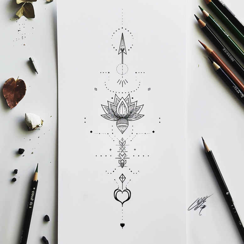An AI-generated tattoo project concept featuring a vertical, symmetry-driven composition that merges compass symbolism, a lotus motif, and a delicate heart in a continuous line. The top anchor resembles a compass rose, followed by a radiant mandala-like core, then a slender stem of geometric shapes leading to a heart at the base. Executed in black ink with a fine line technique, the piece emphasizes clean spacing, crisp negative space, and minute dot accents that read as a timeless tattoo design suitable for subtle placements. The pattern-rich linework introduces repeated motifs—diamonds, circles, and garland-like flourishes—that create a sense of balance and movement. The lotus representation evokes spiritual growth and purity, while the compass suggests guidance and intention; together they form a meaningful tattoo concept ideal for someone seeking a small but symbolic body art piece. From a stylistic standpoint, the design nods to Japanese-inspired linework and tribal-influenced geometry, translating well into a black-and-grey palette for a refined look. As an AI-generated tattoo project, this concept prioritizes precision and adaptability, offering a custom tattoo design that can be scaled, simplified, or elaborated to suit individual anatomy and skin tone. The result is well-suited for clients seeking meaningful tattoos with a subtle but striking visual impact, and the geometry patterning makes it ideal for those exploring small tattoos or flower tattoos in a refined, fine line aesthetic. If executed, this concept would translate into a versatile piece for coverable placements depending on scale, while preserving the legibility of the lotus and compass motifs in a subdued black and grey ink.