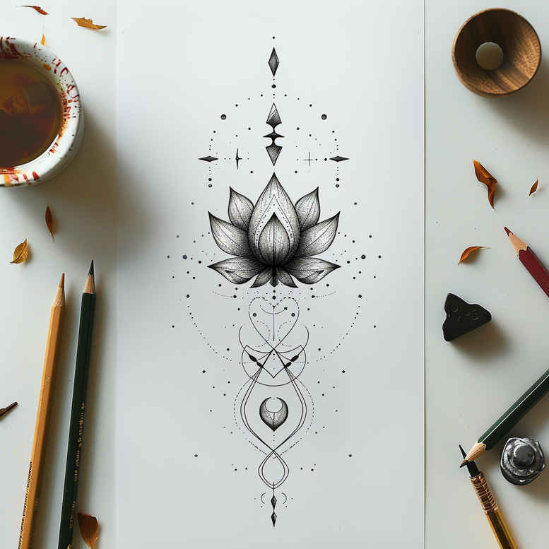 An AI-generated tattoo project concept presenting a lotus-inspired design anchored by precise geometric linework. Central to the piece is a lotus flower rendered in subtle black and grey shading, its layered petals opening toward a meditative focal point. Above and below the bloom, a sequence of geometric motifs—circles, triangles, fine lines, and dot work—creates vertical symmetry and a sense of axial balance, echoing mandala and Japanese style tattoo aesthetics while staying contemporary in a fine line vocabulary. The design uses negative space and delicate shading to achieve depth without heavy blacks, producing a clean, ink-ready tattoo design suitable for a small to medium canvas. The lotus symbolizes purity, renewal, and resilience; the geometric lattice conveys order, discipline, and an ongoing infinity tattoo motif, lending a modern aura to a timeless symbol. Executed in black and grey, the shading relies on subtle gradients rather than solid fills, ensuring a refined, aging-friendly look that remains legible as it heals. This concept borrows from tribal symmetry and Japanese influence while preserving a minimalist silhouette that suits cover-up potential if applied later on, though it works beautifully as a stand-alone piece. Being AI-generated, the concept demonstrates how algorithms can aid artists in exploring crown-like linework, precise dot shading, and scalable geometry, delivering repeatable precision for tattoo studios and clients alike. Key elements include the lotus core, geometric lattice, vertical alignment, dot shading, infinity tattoo motif, and a restrained gradient that preserves line clarity. The result is a versatile tattoo design that fits both first-timers and seasoned collectors seeking a quiet, meaningful statement piece with spiritual resonance, and it exemplifies how black and grey ink can render a lotus motif with a refined, realistic feel within body art.