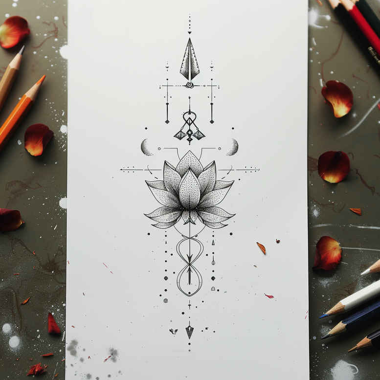 This tattoo design concept presents a lotus flower anchored by a geometric mandala sequence, rendered in black and grey with a refined fine-line technique. The central lotus features delicate, tapering petals that open outward, while a calculated arrangement of circles, diamonds, dots, and straight connectors forms a vertical halo that reinforces symmetry and flow. The pattern reads as both natural and architectural, allowing the piece to function as a standalone tattoo or as a complementary element within a larger composition such as a sleeve. The technique emphasizes clean, ultra-fine strokes and restrained shading to preserve readability on skin, ensuring the design remains legible at smaller sizes and ages gracefully with time. Symbolically, the lotus denotes renewal and spiritual awakening, while the surrounding geometry suggests balance, continuity, and the wearer’s personal trajectory—ideas that resonate in many meaningful tattoos. The black and grey palette provides versatile contrast across skin tones, enabling easy integration with other motifs, including rose or flower tattoos, Japanese style influences, or tribal elements, should the client wish to evolve the design. The piece is suitable for someone seeking a small-to-medium statement with lasting impact, or as a precise center point for a larger body art concept. As an AI-generated tattoo project concept, it demonstrates how contemporary line work and traditional symbolism can converge into a meaningful design that remains legible and elegant across settings. For artists, the geometry offers clear guidelines for spacing and symmetry, while the lotus anchors the composition with timeless symbolism. In short, this design embodies refined minimalism and intricate patterning, presenting a standout tattoo design choice for those drawn to monochrome fine-line tattooing.