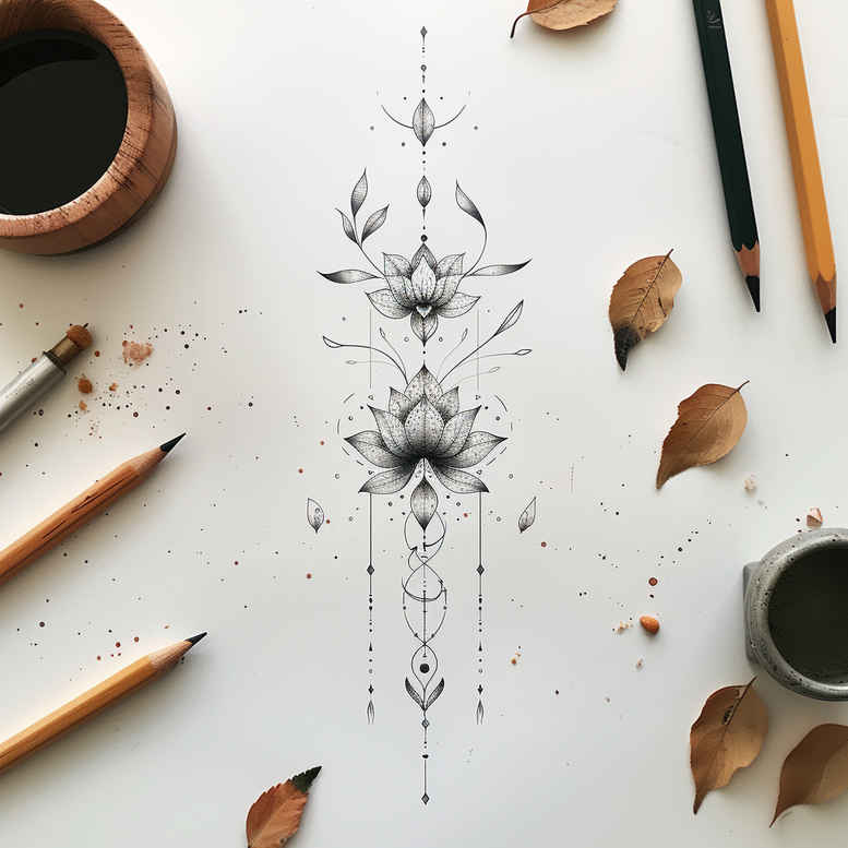 This AI-generated tattoo project concept presents a geometric mandala rendered in black-and-grey fine line on a pristine white surface. The central motif radiates symmetry: concentric circles, diamonds, and slender spokes converge along a vertical axis, evoking balance, focus, and continuity. Executed with precise line work and restrained shading, the composition relies on deliberate negative space to create depth without solid fills, a hallmark of fine line tattoo technique that remains crisp when scaled for small tattoos or expanded into larger panels. Surrounding the core motif are tangible studio elements—a pencil, sheets of paper, scattered leaves, and an ink pot—that frame the concept as a study in tattoo design rather than a finished commission. The piece emphasizes rhythm, repetition, and geometric discipline, underscoring pattern-based tattoo design while preserving legibility over time. Symbolically, mandalas represent wholeness and a meditative journey; the vertical axis can signify ascent and continuity, while the circular motifs invite reflection, making the concept adaptable to meaningful tattoos for someone seeking subtle symbolismo. While rooted in a contemporary aesthetic, the design nods to Japanese style through restrained line economy and balance, yet remains versatile as a black-and-grey tattoo suitable for small tattoos or more expansive body art depending on placement. This concept invites personalization, such as integrating a lotus flower tattoo or infinity tattoo within the mandala for deeper meaning, and demonstrates how a tattoo design can fuse pattern, texture, and craft to tell a personal story. In sum, it serves as a robust foundation for a custom tattoo design, with clean lines, clear geometry, and scalable potential for ink, pattern work, and meaningful tattoos.