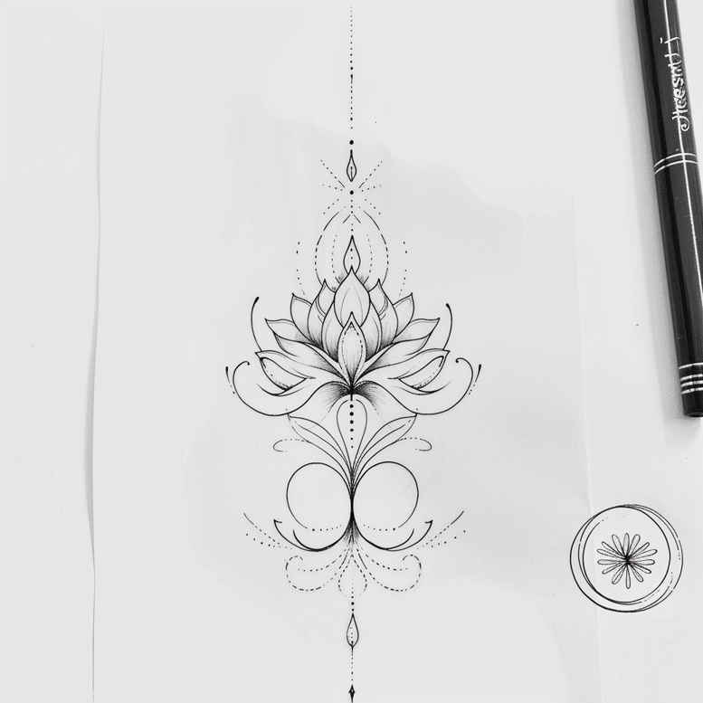 AI-generated tattoo project concept presenting a delicate, symmetrical composition centered on a lotus motif. The design begins with a stylized lotus flower perched atop a slender vertical axis, its petals rendered with fine line precision to convey both grace and restraint. Beneath the blossom, a sequence of rounded elements and teardrop forms creates a pendulous feel, as if the lotus is suspended by an unseen string, while a micro-pattern of lunar crescents and gentle filigree adds depth without crowding the frame. To the right, a small circular seal or medallion anchors the composition, reinforcing balance and an element of personal symbolism within a Japanese-inspired, black and grey aesthetic. The pencil sketch reads as a meticulous study in line weight: crisp outlines, soft shading, and deliberate negative space that ensures readability as a tattoo design even on smaller canvases. The arrangement is deliberately vertical, making it suitable for placement along the forearm, wrist, or spine, and its modular components invite customization—the lotus can be stylized, the pendant motif expanded, or the seal adapted to incorporate initials or a meaningful sigil. As an AI-generated tattoo project, this concept explores how traditional floral symbolism—lotus meaning purity and enlightenment—marshals modern fine line technique to produce a refined piece of body art. The overall look remains versatile, scalable, and easily translatable into a real-world tattoo design with clean black ink on grey shading, ideal for someone seeking a small-to-medium piece with strong pattern-driven rhythm. The inclusion of a central lotus, downward pendant, and right-hand seal creates a visual loop that mirrors cycles of growth and renewal, while the careful layering suggests depth and texture suitable for black and grey realism, a hallmark of contemporary tattoo design. This concept also highlights how you can adapt the motif into related genres such as lotus flower tattoo, infinity tattoo accents, or a rose tattoo design variant, ensuring it functions as both an independent statement and a complementary element within larger sleeve or back pieces, fulfilling the needs of trend-aware clients seeking meaningful tattoos, custom tattoo design, and refined body art, all under the umbrella of ink artistry.