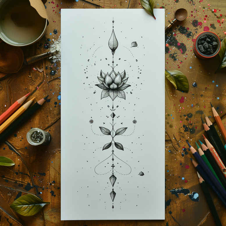 This tall, vertical lotus motif is drawn in black and grey with fine-line edges and subtle dotwork, forming a geometric column that reads as a modern tattoo design concept on paper. The central lotus bloom anchors the composition, with mirrored flourishes above and below to create rhythm, balance, and a sense of ascent. Executed with precise line weights and deliberate negative space, the piece preserves legibility at small scales while offering flexibility for a larger canvas such as the forearm, spine, or ribline. The lotus carries traditional symbolism—the purity of spirit and emergence from murky waters—while the geometric ornaments suggest structure, continuity, and transformation. This design demonstrates how botanical form can blend with geometric pattern to produce a refined tattoo design that works in black and grey ink, or can be adapted to color. The approach showcases technical aspects of fine-line technique, including clean linework, balanced shading, and measured dotwork that adds texture without overpowering the composition. As a ready concept for a custom tattoo design, it invites adaptation of line density, edge sharpness, and the balance between blossom and ornament to suit the wearer’s anatomy. For those seeking meaningful tattoos, this lotus-pattern piece offers a timeless option that pairs well with minimalist or tribal aesthetics, and remains versatile for future personalization; it exemplifies how a vertically oriented piece can convey growth, patience, and inner strength. The rhythm of repeating geometric elements creates a meditative tempo, while the lotus remains the focal point, inviting continual interpretation and refinement by both client and artist. The inclusion of dotwork and linework demonstrates a refined balance between texture and clarity, suitable for small tattoos or extended work on larger body areas; as an AI-generated tattoo project concept, it showcases how digital design can support traditional craftsmanship while preserving artistic intent. In terms of meaning, lotus embodies resilience and awakening, and when paired with angular ornament, the tattoo becomes a timeless expression of personal growth and enduring resolve.