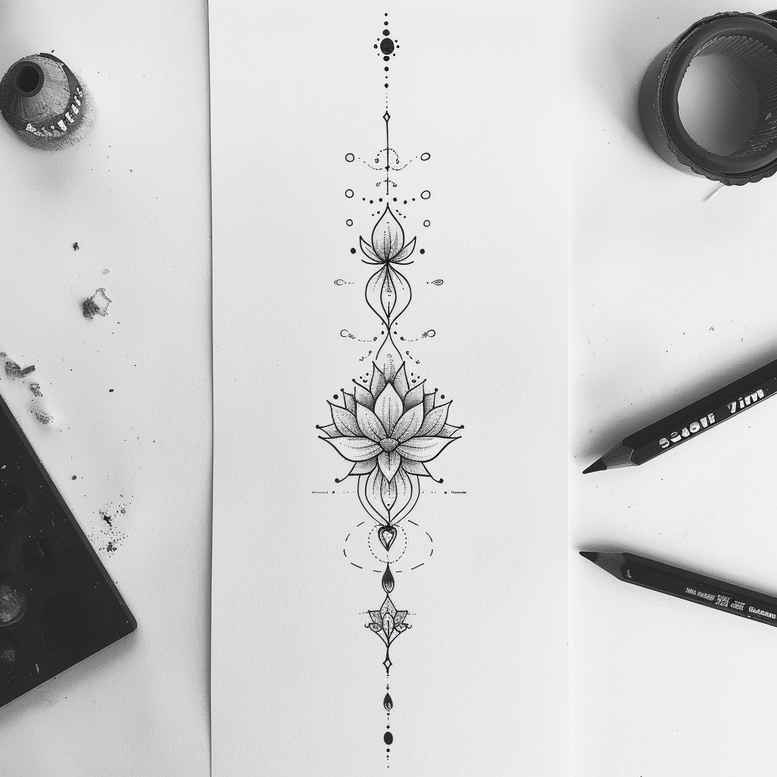Presented here is an AI-generated tattoo project concept featuring a vertically oriented lotus mandala motif rendered in fine-line technique on white paper. The central spine unfolds from a lotus bloom at the base through geometric motifs, beads, and delicate crescents, culminating in a slender apex. The design relies on crisp black lines and generous negative space to achieve a modern, timeless silhouette that translates well into tattoo form. The lotus symbolizes purity and rebirth, while the mandala-inspired rhythm conveys balance and mindfulness; together they create a meaningful tattoo design with universal appeal. This concept leans on Japanese-style linework sensibilities and tribal-geometric influences, delivering a contemporary take on classic motifs such as lotus flower tattoo, infinity tattoo-inspired dot work, and fine-line rose tattoo design aesthetics. While compact enough for small tattoos or a discreet forearm piece, the vertical arrangement also offers versatility for larger formats or for seamless cover-up placements, thanks to its linear continuity and pattern repetition. From a technical perspective, the piece emphasizes fine-line precision, even line weight, and controlled spacing to sustain legibility as ink ages; it also serves as a valuable reference for custom tattoo design workflows, where vector-like consistency benefits clients seeking black and grey or realism-oriented approaches. As an AI-generated concept, it demonstrates how thoughtful composition and motif pairing can yield tattoo ideas that are both decorative and communicative, suitable for body art projects, ink exploration, and meaningful tattoos that resonate with wearers seeking elegance, harmony, and personal symbolism. The inclusion of a persistent geometric spine and pattern motif makes it adaptable for cover-up use, with potential to rework underlying marks while preserving the clean aesthetic, and the concept is collection-ready for small tattoos, flower tattoos, and Japanese-style tattoo explorations in black and grey ink.