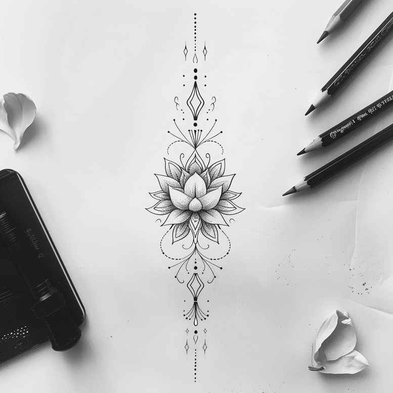 This image presents a refined tattoo concept: a vertical lotus mandala design rendered in black ink with fine line precision. At the center sits a lotus bloom, petals opening in symmetrical layers, anchoring a mandala framework whose delicate filigree radiates upward and downward in a series of geometric motifs, flourishes, and tiny dots. The overall composition emphasizes graceful verticality, making it a natural fit for forearm, spine, or calf placements. The technique showcased favors a fine line approach, with hairline strokes and crisp negative space to create depth without heavy shading; where shading appears it remains subtle to preserve legibility as a small to medium tattoo. The design merges elements drawn from mandala tradition with botanical symbolism: the lotus is a symbol of purity, resilience, and enlightenment, while the surrounding pattern invokes balance, continuity, and the journey inward. This is a nuanced concept suitable for meaning-filled tattoos, including lotus flower tattoo and flower tattoos in general, offering versatility as a standalone piece or as the centerpiece of a larger custom tattoo design. The linework reads as black and grey by virtue of ink density rather than color, which keeps the piece timeless and easy to upgrade with additional elements later. As an AI-generated tattoo project concept, it demonstrates careful spacing, proportion, and motif repetition that a skilled inker can translate into a final body-art piece; the patterning provides a ready-made scaffold to explore scale, spacing, and additional geometric accents. In terms of SEO, the concept aligns with terms like tattoo design, meaningful tattoos, fine line tattoo, tattoo design, lotus flower tattoo, infinity tattoo, tribal tattoo influences, rose tattoo design, small tattoos, flower tattoos, custom tattoo design, black and grey realism, and body art ink. The work foregrounds craft, while inviting personalization for client symbolism, placement, and size.