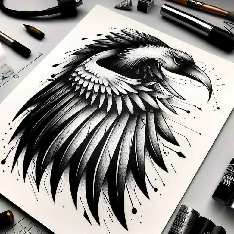 A raven wing tattoo design rendered in black and grey, presented on a sheet of paper with drafting tools, illustrating an AI-generated tattoo project that translates into a striking body art concept. The raven’s plumage flows in sweeping, tapered feathers, formed by a dense weave of lines that create a graphic pattern while maintaining a sense of realism through careful shading. The piece emphasizes contrast and depth, with bold silhouettes for the wing and head balanced by delicate gradations of grey to imply texture and contour. As an idea, it is highly adaptable to various placements, from forearm to back, and its pattern-like feather arrangement can be scaled or rearranged without losing coherence. The design embraces fine line tattoo aesthetics, delivering crisp line work, smooth transitions, and a monochrome palette that aligns with black and grey tattoo traditions. Symbolically, the raven evokes mystery, intelligence, and transformation, while the extended wing suggests ascent and protection. Practically, artists can use this concept as a cover-up solution by leveraging its dense shading to obscure older inks while preserving a powerful silhouette. The calligraphic feather lines also offer opportunities to customize spacing and curvature to suit limb anatomy. This description weaves in SEO keywords such as tattoo, tattoo design, meaningful tattoos, fine line tattoo, lotus flower tattoo, infinity tattoo, tribal tattoo, rose tattoo design, small tattoos, flower tattoos, custom tattoo design, Japanese style tattoo, black and grey, realistic tattoo, body art, ink, underscoring its relevance to readers and search engines. For very dark applications, the cover-up potential is even more pronounced, since the solid black areas can mask underlying tattoos while delivering a visually striking motif. AI-generated tattoo projects like this one exemplify how technology can seed creative explorations for clients seeking distinctive, enduring monochrome artwork.