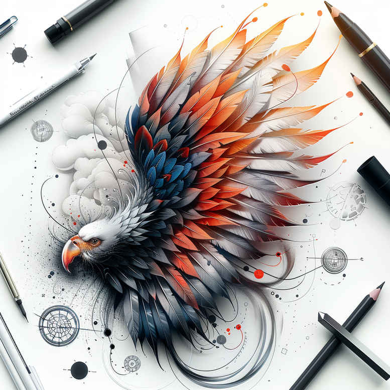 This AI-generated tattoo project presents a vivid phoenix rendered in a watercolor-inspired style, its plumage flashing orange and blue with bold black shadows against a clean white background. The composition centers on a flowing arc of feathers, each quill treated with fine line precision while color washes blur toward the edges to convey motion and heat. The design nods to Japanese style tattoo silhouette and traditional bird motifs, yet remains distinctly contemporary through strong contrast, layered shading, and kinetic energy. Surrounding elements resemble subtle pattern accents—circular rings and orbiting specks—that provide texture without competing with the main bird, making this concept suitable as a stand-alone tattoo design or as a cover for existing work in need of a graceful upgrade. The symbolism speaks to rebirth, resilience, and transformation, aligning with meaningful tattoos and personal narratives; it also invites integration with other symbols such as a lotus flower tattoo, infinity tattoo, or rose tattoo design for a broader story. From a technical standpoint, the piece supports a spectrum of ink approaches: full color for dramatic impact, black and grey for a classic or realistic tattoo aesthetic, or fine line detailing to preserve clarity on smaller placements. The watercolor technique demands careful gradient control and crisp feather tips to maintain legibility over time, especially on larger canvases like sleeves or backs, while still offering flexibility for smaller tattoos. For clients seeking compact options, the core phoenix can be distilled into a bold, readable silhouette suitable for a wrist or ankle. As an AI-generated tattoo project, this concept demonstrates how digital ideation can inform custom tattoo design, guiding artists toward a unique body art piece that blends realism with expressive color and symbolic depth, and it invites storytellers to weave personal meaning into ink across generations.