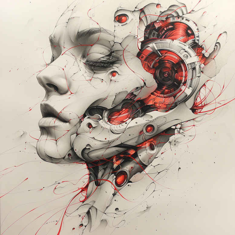 A finely balanced composition that pairs a serene female profile with red mechanical gears and tubing, rendered in black and grey with restrained crimson accents. The central face is softly shaded with precise line work that preserves lifelike presence, while the surrounding gearwork and conduits wrap around the temple and jawline, creating a surreal dialogue between humanity and machinery. The red components serve as focal points, guiding the eye along the contour of the cheek and neck and reading as circuitry or vascular pathways, thereby infusing the portrait with kinetic symbolism. This tattoo design resides squarely in the fine line tradition, characterized by crisp outlines, delicate shading, and deliberate negative space that preserves legibility over time. The grayscale palette ensures broad skin-tone compatibility and aging gracefully, while the selective red adds drama without overwhelming the composition. From a craft perspective, the piece demonstrates precise contouring, micro-detailing in the gears, and thoughtful placement that can adapt to the shoulder, forearm, or chest. For seekers of meaningful tattoos, the motif speaks to themes of memory, time, and identity, inviting contemplation of the self in an age of technology. This is an AI-generated tattoo project, illustrating how digital concepts translate into ink-ready design and offering a template for a custom tattoo design adaptable to various placements. The visible elements—the face, the gear mechanism, and the tubing—form a triad that can be reimagined with alternative motifs such as a lotus flower tattoo or rose tattoo design while maintaining the same tonal balance. Although rooted in black and grey realism, color can be introduced selectively to heighten impact, aligning with trends in small tattoos or larger body art. Overall, the piece blends portraiture with pattern and hardware, presenting a contemporary, sophisticated approach to body art and a strong foundation for a cover-up-friendly redesign if desired.