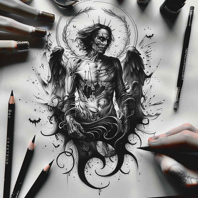 This dark, pattern-rich concept presents a central figure rendered in black and grey with dense shading and fine line detailing to create depth on skin. The subject is a winged, robed figure with a halo, surrounded by ornamental swirls and circular motifs that echo traditional Japanese and tribal tattoo elements. Executed as a standalone study on paper, the composition relies on negative space and heavy black areas to anchor the silhouette while precise linework defines lace-like folds, feather texture, and the halo’s glow. The surrounding swirls function as a built-in pattern that can extend into sleeves, chest, or back pieces, offering versatility for placement and scale. The piece reads as a mythic or spiritual portrait, yet its contrast and mood make it an excellent candidate for a cover-up, because the dense black ink can blend with or over existing tattoos to create a fresh narrative while disguising older work. For tattoo lovers seeking a custom tattoo design, this concept demonstrates how a bold black and grey strategy, when combined with fine line accents and ornamental patterns, can translate into both a realistic or stylized body art solution. The design supports multiple translations, from a restrained small tattoo to a larger back piece, and invites adaptation into lotus flower tattoo or infinity tattoo motifs if the wearer desires a personal symbolism. In terms of technique, the study showcases controlled stippling and line variation to achieve texture in cloak and wings, as well as crisp, dark outlines that retain legibility on skin over time. Though presented as an AI-generated tattoo project, the concept remains a blueprint for meaning-rich ink that can be refined by a skilled artist to suit individual stories and placements.