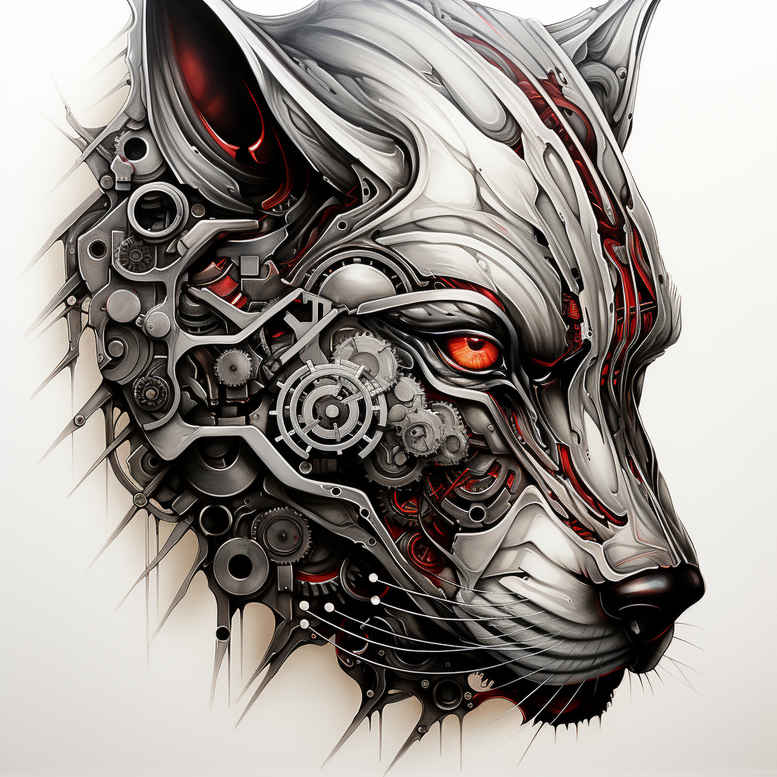 This biomechanical wolf portrait fuses organic form with machine-inspired geometry in a black and grey palette, presented here as an AI-generated tattoo project. The centerpiece is a wolf head whose muzzle and brow are etched with interlocking gears, cog plates, riveted seams, and subtle linework that mimic muscle fibers while suggesting a living machine. A vivid red eye acts as a dramatic focal point against the subdued grayscale shading, drawing the viewer into the design. Crisp outlines give way to soft gradients, delivering depth and texture that read as sculpture on skin, while the mechanical elements follow the natural contours of the skull to create a cohesive flow that could wrap the shoulder, sleeve, or back. Symbolically, the wolf embodies strength, guardianship, and tenacity, while the apparatus of gears and plates signals resilience and the fusion of nature with technology—an ideal theme for meaningful tattoos about transformation and endurance. Because of its dense, dark tonal range and dense patterning, this concept is particularly suitable as a cover-up for older ink, as the gears can be arranged to mask existing shapes while still delivering legible imagery from distance. The design leans toward realistic black and grey with a biomechanical edge, yet it can be tuned toward a more graphic, high-contrast look for bold body art. For practitioners seeking a custom tattoo design, this concept provides a robust template with adjustable density, gear density, and line weight to accommodate skin tone and placement preferences; it also nods to Japanese style tattoo influences in its disciplined composition and the integration of natural and technical motifs. As an AI-generated tattoo project, it serves as a versatile reference for ink artists pursuing a striking, pattern-rich skull-and-gear narrative that elevates tattoo storytelling in ink.