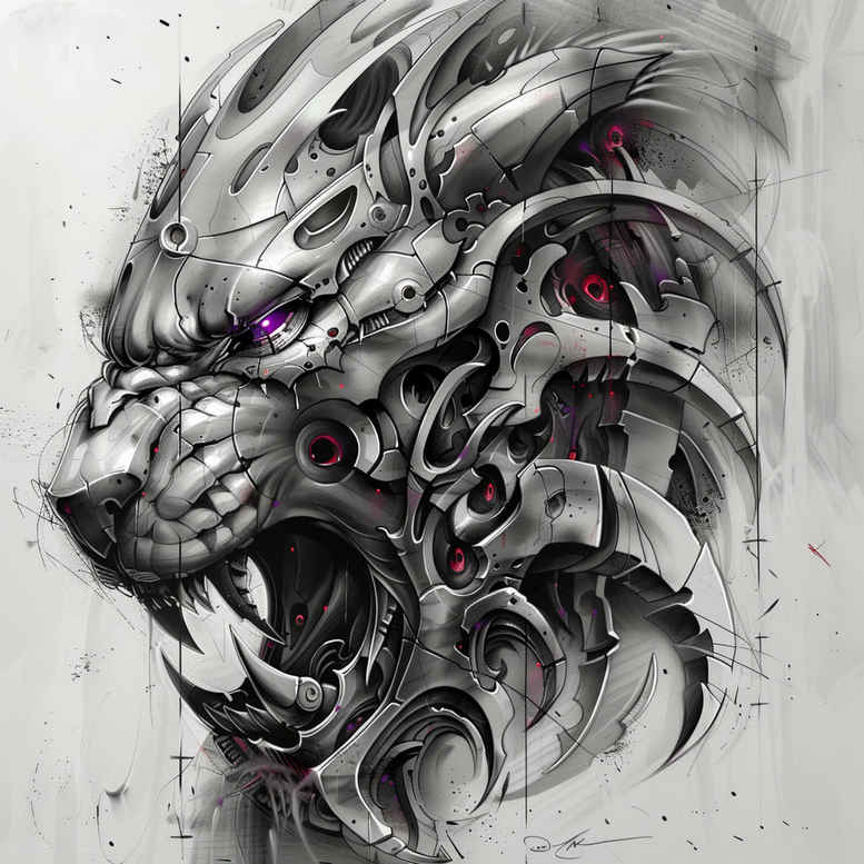 An AI-generated tattoo project presents a dark biomechanical dragon head rendered in black and grey, where sculpted plates, gears, and tubing compose a fierce mask across the skin. The design leans into graphic patterns, with interlocking arcs and riveted textures that read as machinery woven into flesh. The composition uses high-contrast shading: solid blacks anchor the outer edges while subtle midtones and delicate gradients create depth in the jaw, scales, and gears. Purple eye accents provide a focal point, complemented by restrained red highlights that brighten strategic seams. Surrounding negative space dissolves into smoke-like drift, allowing the piece to move with limb contours and ensuring legibility on larger canvases. Technically, the tattoo relies on bold linework to define the silhouette, reinforced by smooth shading to simulate metallic surfaces and an air of volume. The biomechanical motif fuses organic dragon features with engineered components, conveying themes of resilience, transformation, and the convergence of myth and machine. For a cover-up, the dense black areas and intricate negative space make it an excellent candidate to conceal older tattoos; the design can be scaled and adjusted to wrap around joints, using the machinery elements to redirect attention from prior marks. The piece nods to broader traditions—stemming from Japanese style tattoo’s balance and flow—while remaining distinctly modern and graphic in black and grey. In practice, this is a refined example of a custom tattoo design and ink work that prioritizes impact, longevity, and meaning. AI-generated tattoo projects like this illustrate how modern algorithms can conceive cohesive narratives within body art, offering options for meaningful tattoos that pair a forceful image with adaptable cover-up potential. Keywords: tattoo, tattoo design, meaningful tattoos, fine line tattoo, lotus flower tattoo, infinity tattoo, tribal tattoo, rose tattoo design, small tattoos, flower tattoos, custom tattoo design, Japanese style tattoo, black and grey, realistic tattoo, body art, ink, cover-up, pattern.