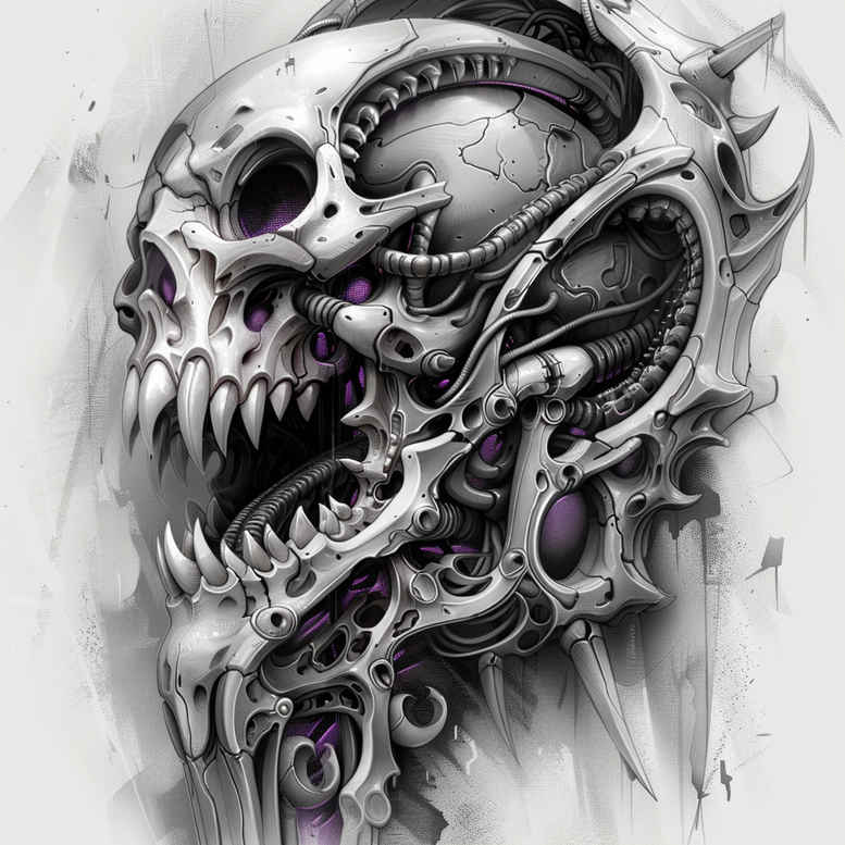 This AI-generated tattoo project presents a biomechanical skull motif where a towering skull is fused with interlocking gears, curling tubes, and horn-like spikes, all rendered in black and grey with a subtle purple gem accent. The shading builds volume through smooth transitions from deep ebony to soft grayscale, while crisp linework defines gear teeth, filigree, and the ornate swirls that weave through the composition. As a tattoo design, it reads as both aggressive and refined, marrying industrial machinery with gothic anatomy to create a versatile piece suitable for a statement sleeve or a bold standalone work. The central skull anchors the design, surrounded by rotating cogwork and threaded tubes that imply motion and complexity, with the purple gem serving as a focal point that draws the eye toward the heart of the mechanism. The dense graphic patterning lends a dramatic, cover-up-ready quality, allowing it to conceal underlying marks beneath strong shading and layered linework when placed strategically on the body. Meaning-wise, the skull often symbolizes mortality and resilience, while gears evoke time, transformation, and craftsmanship; together they form a meaningful tattoo design for enthusiasts of industrial, steampunk, and Japanese-inspired patterning. The piece scales well from small tattoos to larger installments, with fine line accents that can be incorporated to enhance mascara-thin details while preserving legibility over time. This description reflects an AI-generated tattoo project approach, offering a high-detail template that a skilled artist can adapt into durable body art, aligned with the broader tattoo lexicon including custom tattoo design, black and grey realism, and bold geometric elements.