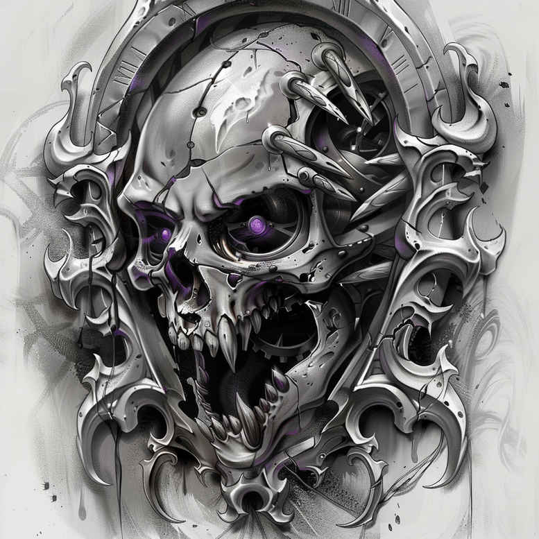 AI-generated tattoo project presents a striking, dark skull wrapped in an intricate filigree frame rendered in black and grey. The central skull is sculpted with high-contrast shading to evoke bone texture while the surrounding metalwork weaves a pattern of ornate curling motifs and armor-like edges that read as protection around the design. Subtle purple accents appear in the eye sockets, drawing focus and giving a contemporary twist to a classic macabre subject. The composition balances negative space against dense ornament, allowing the piece to function as a bold statement on the body while preserving legibility of every detail at a substantial scale. From a design perspective, the artwork blends realism with graphic patterning, offering a versatile vision for a custom tattoo design. While the skull anchors the theme in mortality, the filigree patterning introduces a medieval fantasy aura, suggesting resilience and transformation. This tattoo design is suitable for a large back, chest, or arm sleeve, and is especially well-suited as a cover-up over older ink due to its heavy dark masses that can mask underlying color. The piece borrows ideas from traditional Japanese style tattoo influences, as well as lotus flower tattoo motifs, infinity tattoo symbolism, and tribal tattoo linework, while remaining rooted in a cohesive grayscale palette that suits black and grey realism. It also stands as a strong foundation for small tattoos or flower tattoos in complementary areas when expanded into a sleeve. The grayscale layering explores midtones through careful cross-hatching and stippling, enriching texture and depth in the skull bone, metal filigree, and shadowed recesses. This is an AI-generated tattoo project, designed to push the boundaries of composition and texture through graphic patterning and meticulous shading; the result is a tattoo design with a dramatic, timeless silhouette and meaningful tattoos potential for those seeking a cover-up-ready piece with bold, enduring presence.